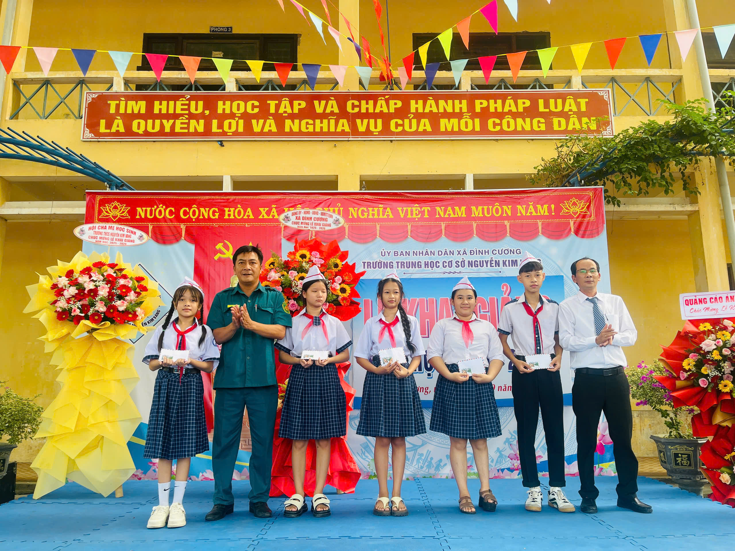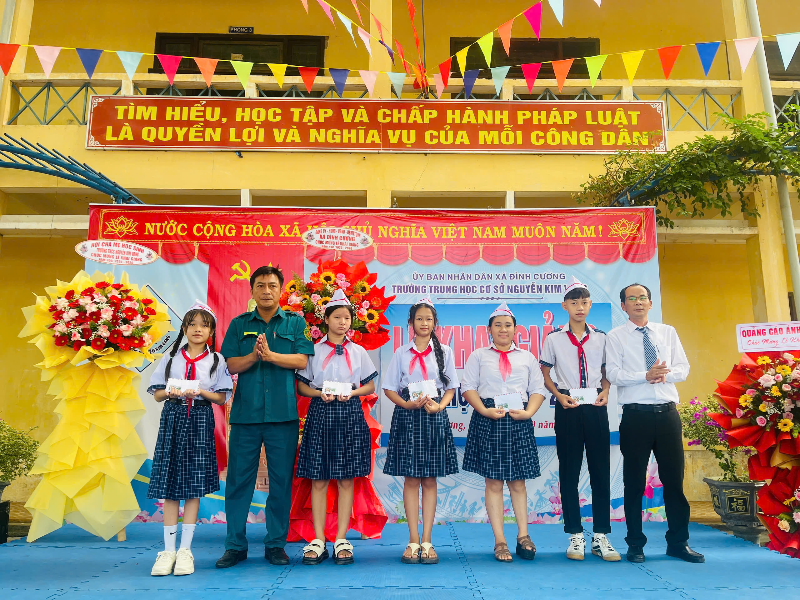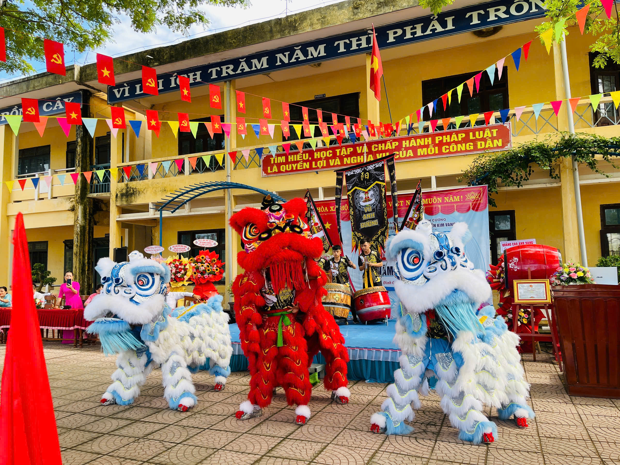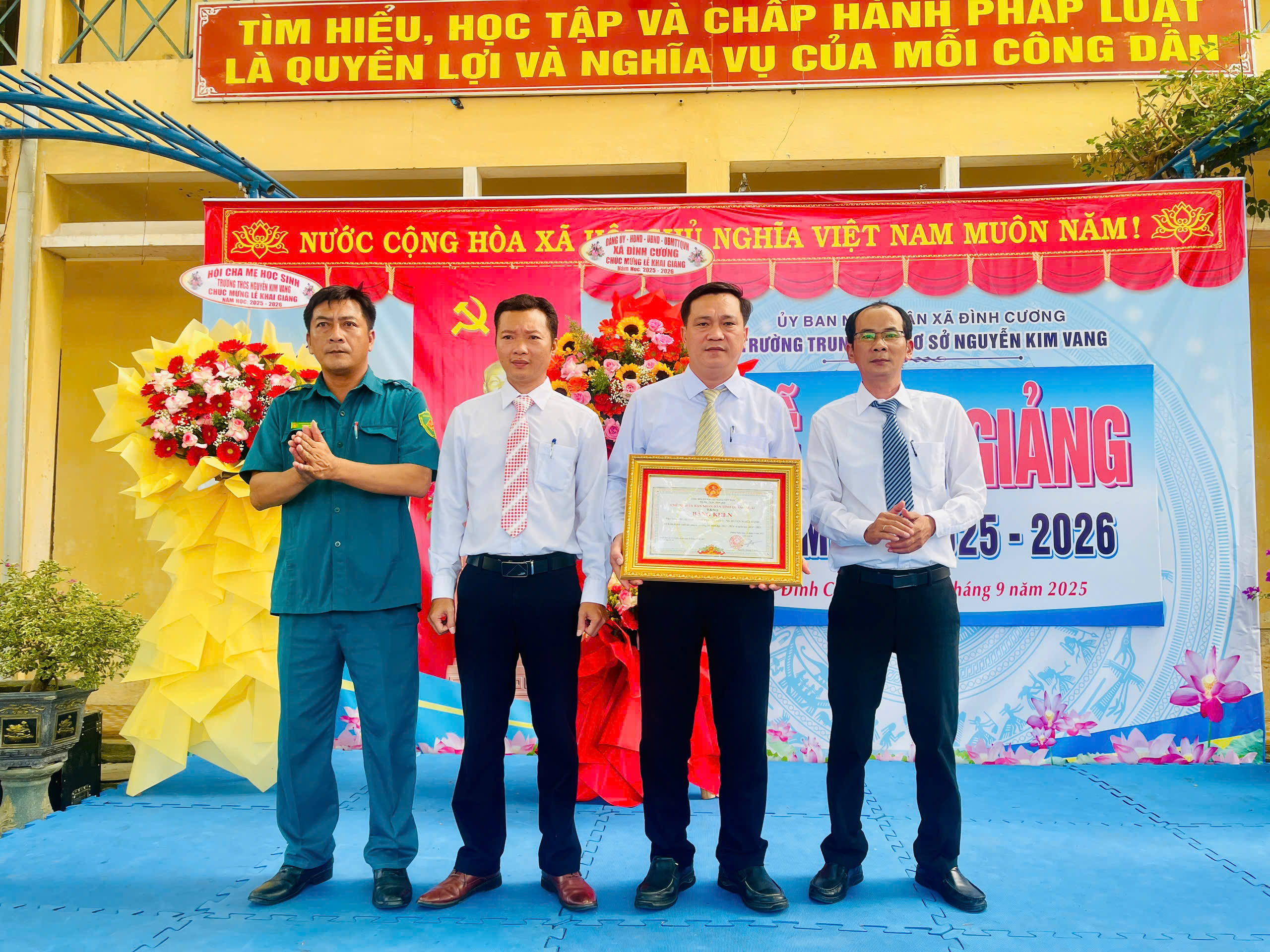 Thực hiện hướng dẫn của Bộ GD&ĐT, sở GD&ĐT tỉnh Quảng Ngãi và UBND xã Đình Cương về việc tổ chức Lễ Khai giảng năm học 2025 – 2026 gắng với sự kiện kỷ niệm 80 năm Thành lập Bộ Quốc gia Giáo dục (nay là Bộ Giáo dục và Đào tạo). Đến dự Lễ Khai giảng năm học 2025 – 2026 của Trường THCS Nguyễn Kim Vang có các quý vị đại biểu: đ/c Trần Văn Vàng – UVBTV Đảng ủy – Chỉ huy trưởng BCHQS xã Đình Cương; đ/c Hồ Ngọc Chí – Đảng ủy viên – Phó chánh văn phòng Đảng ủy, Đại diện ban cha mẹ học sinh. Về phía nhà trường có Thầy Đỗ Đình Thanh – Bí thư chi bộ – Hiệu trưởng nhà trường; Thầy Phan Văn Thạch – Phó bí thư chi bộ – Phó hiệu trưởng nhà trường và toàn thể CBGVNV và 386 học sinh nhà trường. Trong lễ khai giảng được thực hiện thành 2 phần. Phần thứ nhất: Đón học sinh lớp 6, văn nghệ, trao bằng khen của UBND tỉnh đạt thành tích xuất sắc hai năm liền (2023-2024 và 2024-2025); múa lân chúc mừng và tặng 30 suất quà cho học sinh khó khăn do UBND xã Đình Cương và các tổ chức mạnh thường quân trao tặng. Phần thứ hai: dự khai giảng trực tuyến cùng học sinh cả nước trong không khí vui tươi phấn khởi./.