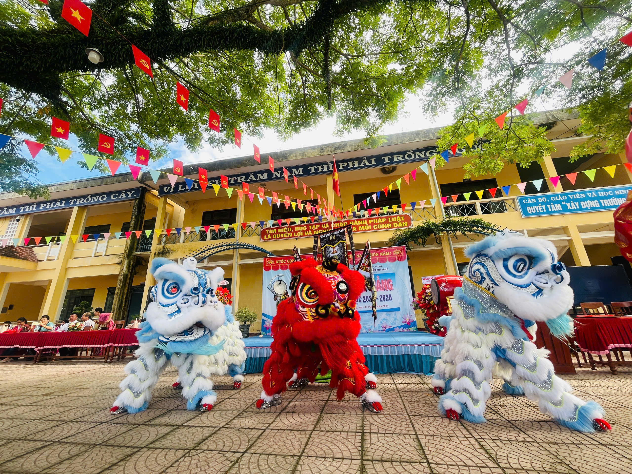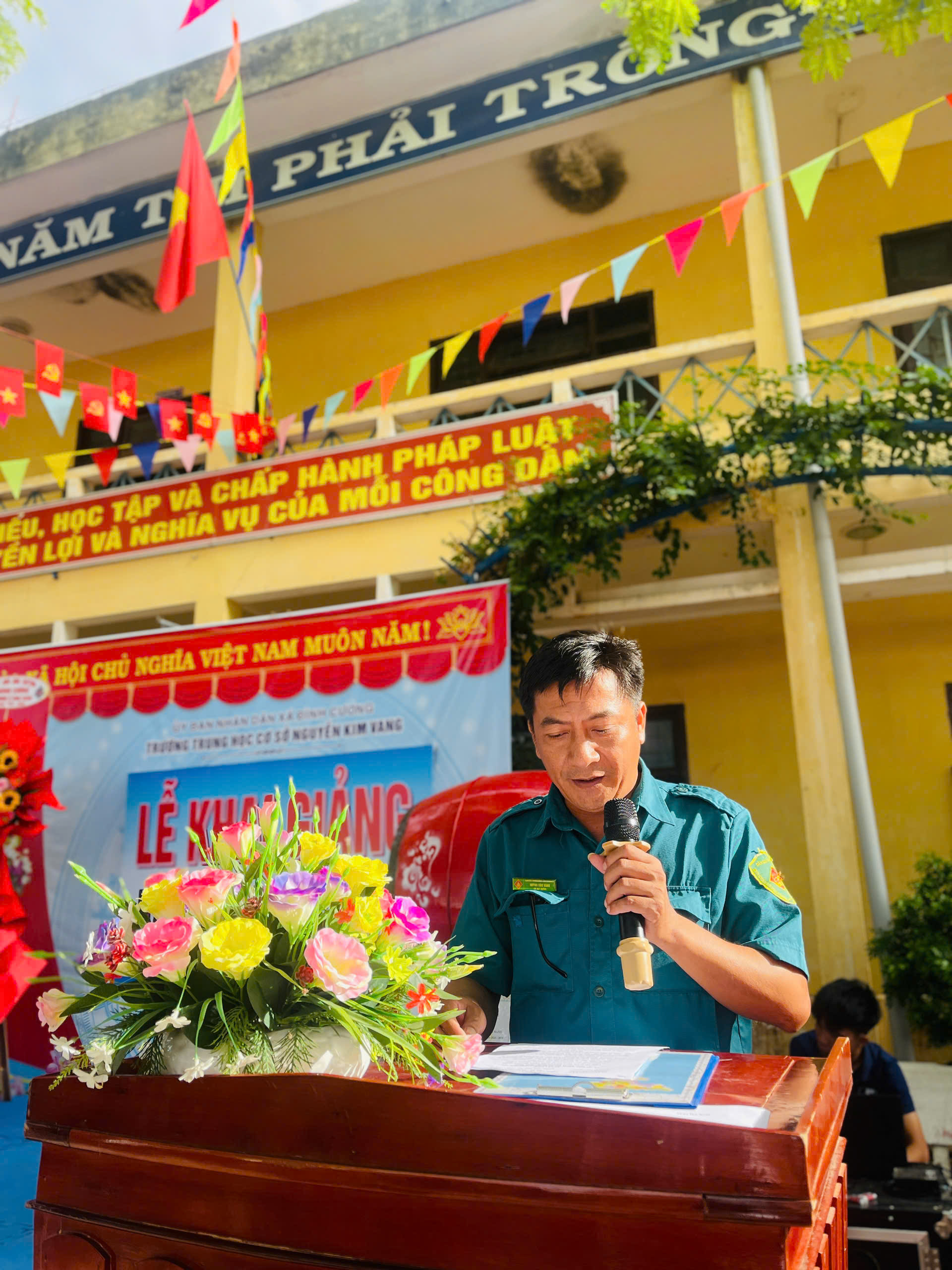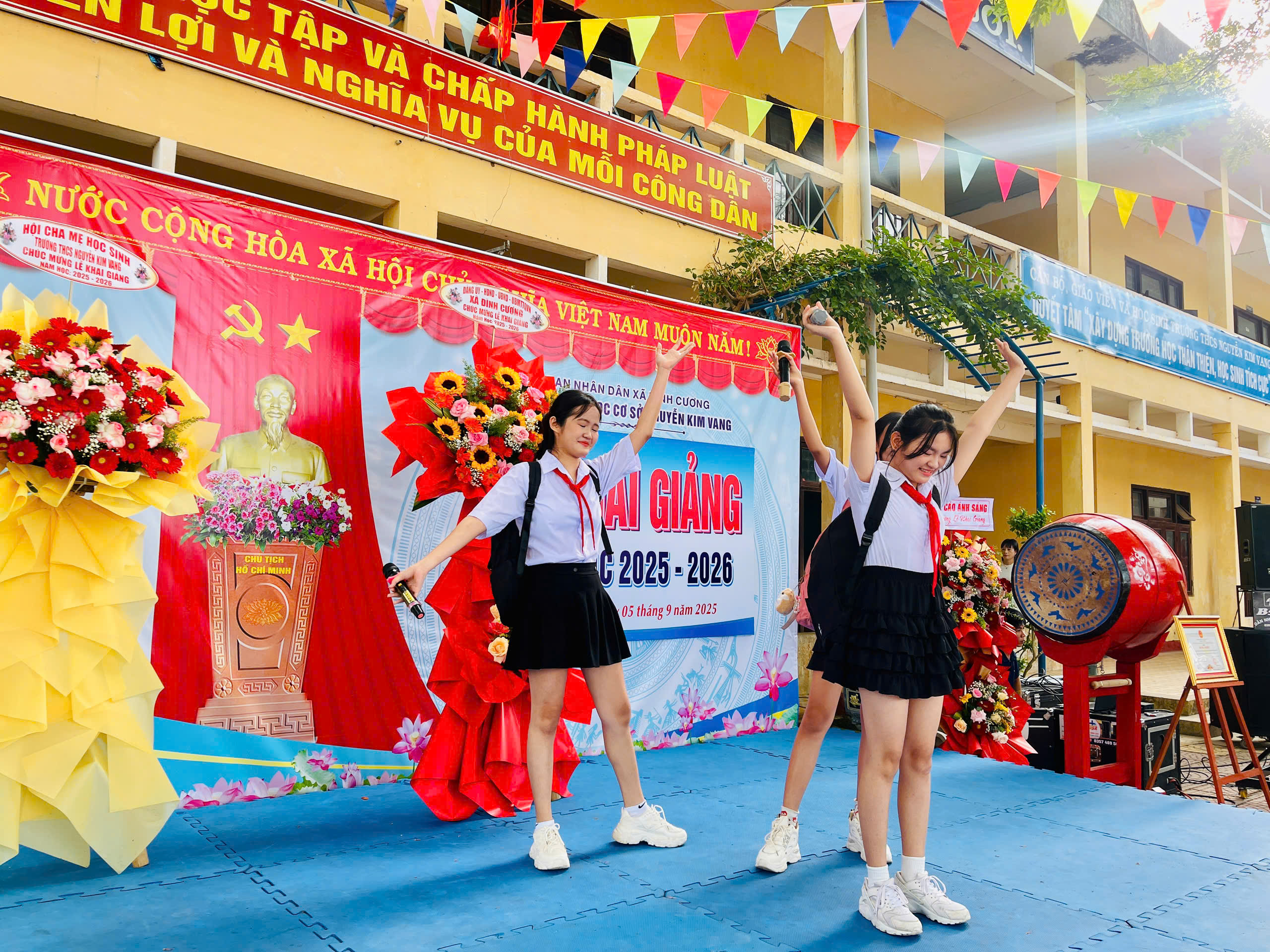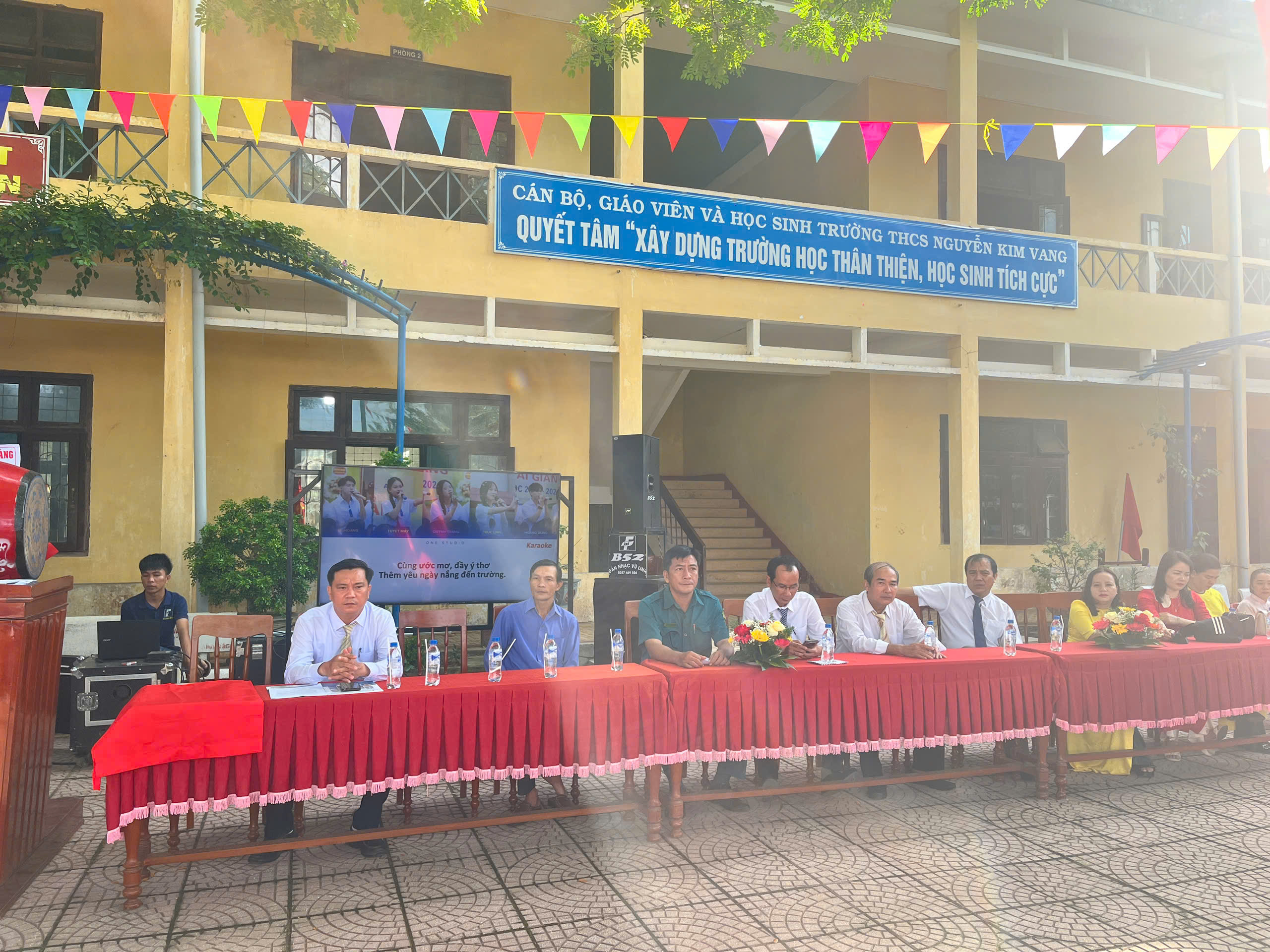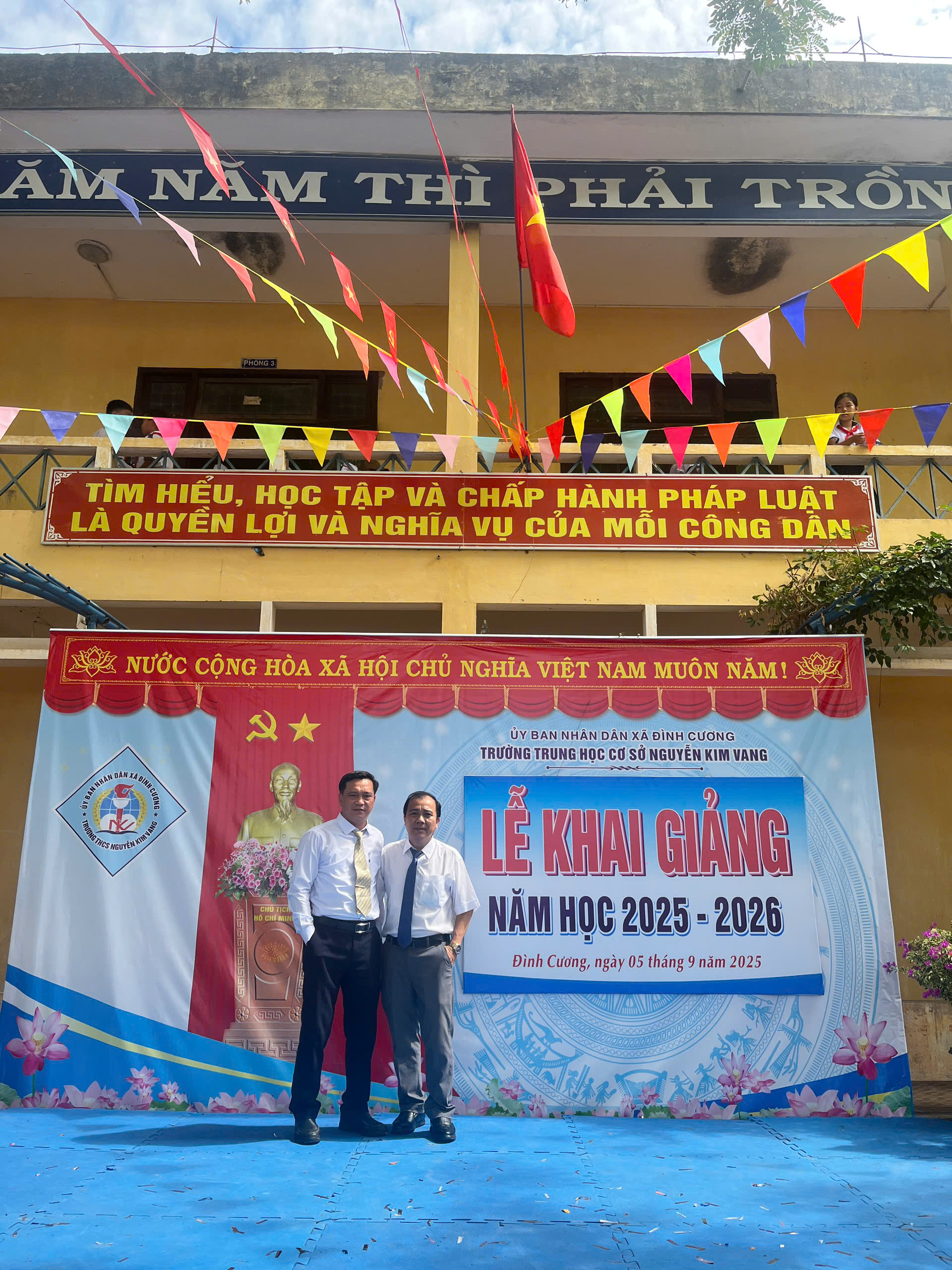 Thực hiện hướng dẫn của Bộ GD&ĐT, sở GD&ĐT tỉnh Quảng Ngãi và UBND xã Đình Cương về việc tổ chức Lễ Khai giảng năm học 2025 – 2026 gắng với sự kiện kỷ niệm 80 năm Thành lập Bộ Quốc gia Giáo dục (nay là Bộ Giáo dục và Đào tạo). Đến dự Lễ Khai giảng năm học 2025 – 2026 của Trường THCS Nguyễn Kim Vang có các quý vị đại biểu: đ/c Trần Văn Vàng – UVBTV Đảng ủy – Chỉ huy trưởng BCHQS xã Đình Cương; đ/c Hồ Ngọc Chí – Đảng ủy viên – Phó chánh văn phòng Đảng ủy, Đại diện ban cha mẹ học sinh. Về phía nhà trường có Thầy Đỗ Đình Thanh – Bí thư chi bộ – Hiệu trưởng nhà trường; Thầy Phan Văn Thạch – Phó bí thư chi bộ – Phó hiệu trưởng nhà trường và toàn thể CBGVNV và 386 học sinh nhà trường. Trong lễ khai giảng được thực hiện thành 2 phần. Phần thứ nhất: Đón học sinh lớp 6, văn nghệ, trao bằng khen của UBND tỉnh đạt thành tích xuất sắc hai năm liền (2023-2024 và 2024-2025); múa lân chúc mừng và tặng 30 suất quà cho học sinh khó khăn do UBND xã Đình Cương và các tổ chức mạnh thường quân trao tặng. Phần thứ hai: dự khai giảng trực tuyến cùng học sinh cả nước trong không khí vui tươi phấn khởi./.