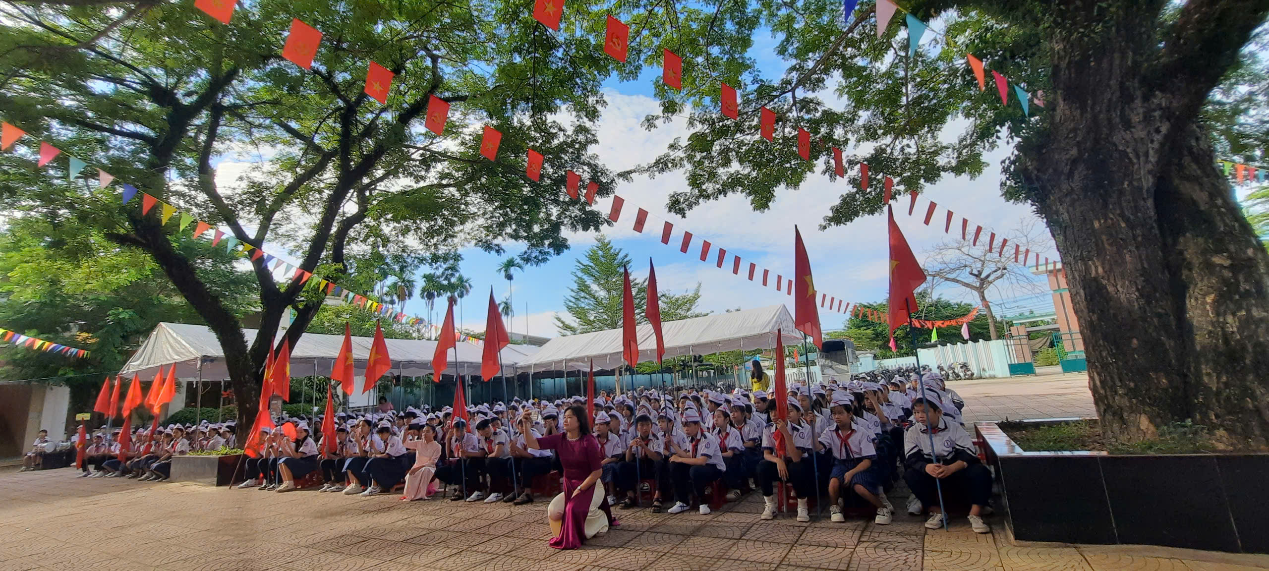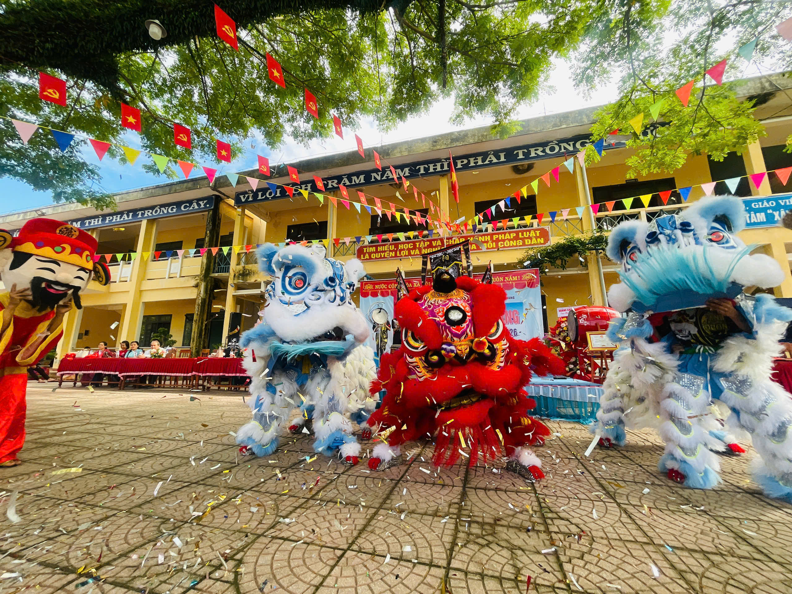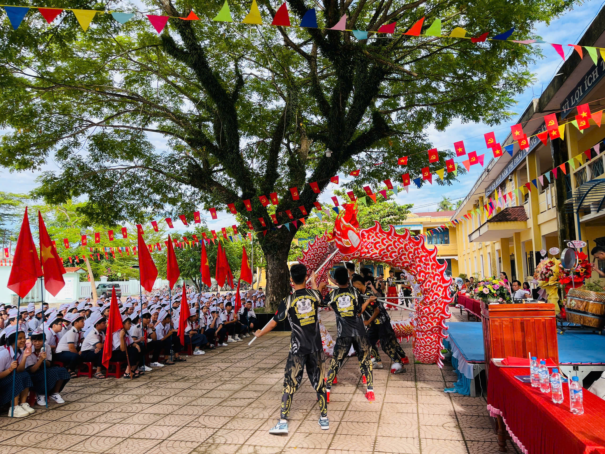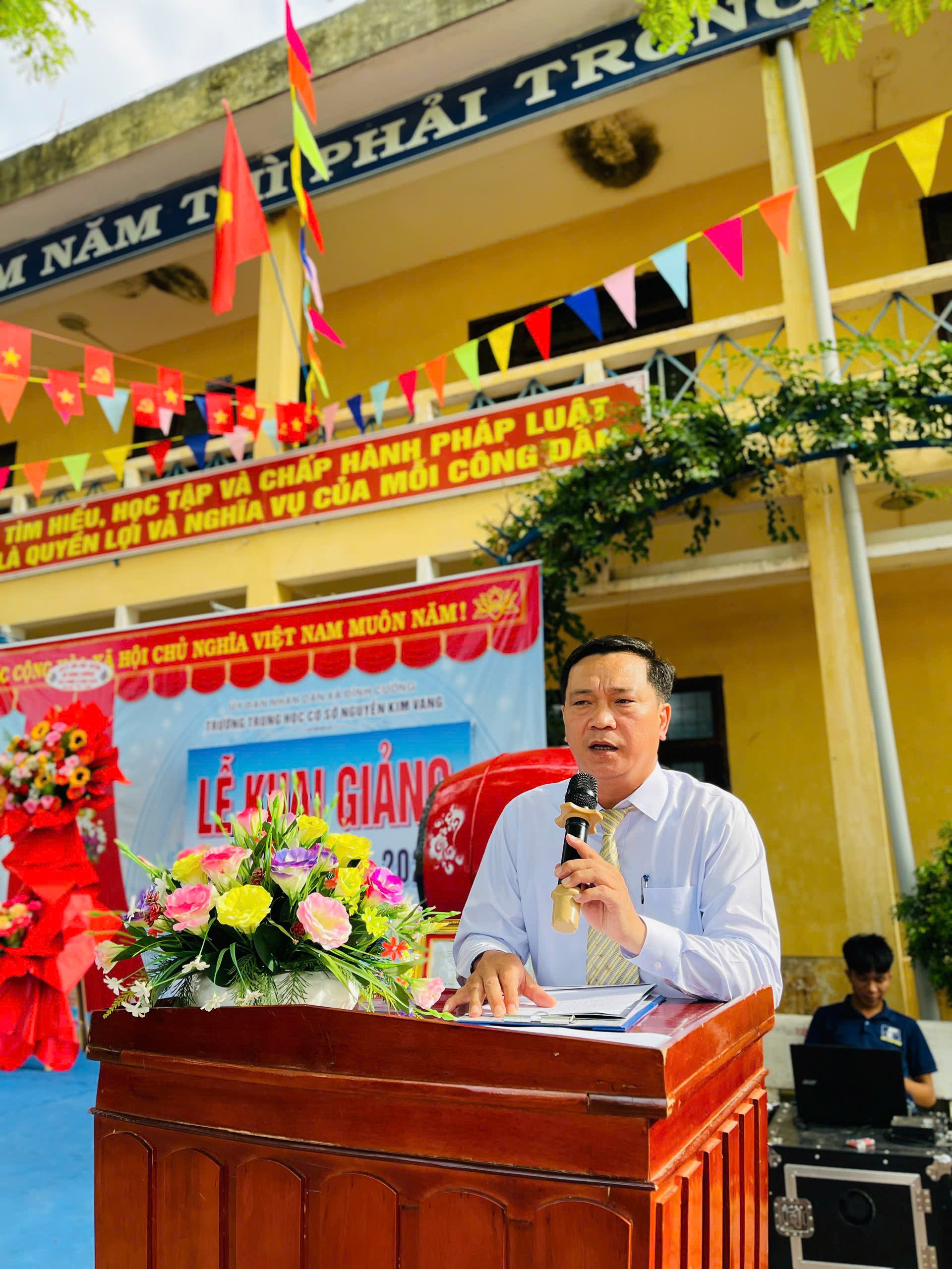 Thực hiện hướng dẫn của Bộ GD&ĐT, sở GD&ĐT tỉnh Quảng Ngãi và UBND xã Đình Cương về việc tổ chức Lễ Khai giảng năm học 2025 – 2026 gắng với sự kiện kỷ niệm 80 năm Thành lập Bộ Quốc gia Giáo dục (nay là Bộ Giáo dục và Đào tạo). Đến dự Lễ Khai giảng năm học 2025 – 2026 của Trường THCS Nguyễn Kim Vang có các quý vị đại biểu: đ/c Trần Văn Vàng – UVBTV Đảng ủy – Chỉ huy trưởng BCHQS xã Đình Cương; đ/c Hồ Ngọc Chí – Đảng ủy viên – Phó chánh văn phòng Đảng ủy, Đại diện ban cha mẹ học sinh. Về phía nhà trường có Thầy Đỗ Đình Thanh – Bí thư chi bộ – Hiệu trưởng nhà trường; Thầy Phan Văn Thạch – Phó bí thư chi bộ – Phó hiệu trưởng nhà trường và toàn thể CBGVNV và 386 học sinh nhà trường. Trong lễ khai giảng được thực hiện thành 2 phần. Phần thứ nhất: Đón học sinh lớp 6, văn nghệ, trao bằng khen của UBND tỉnh đạt thành tích xuất sắc hai năm liền (2023-2024 và 2024-2025); múa lân chúc mừng và tặng 30 suất quà cho học sinh khó khăn do UBND xã Đình Cương và các tổ chức mạnh thường quân trao tặng. Phần thứ hai: dự khai giảng trực tuyến cùng học sinh cả nước trong không khí vui tươi phấn khởi./.