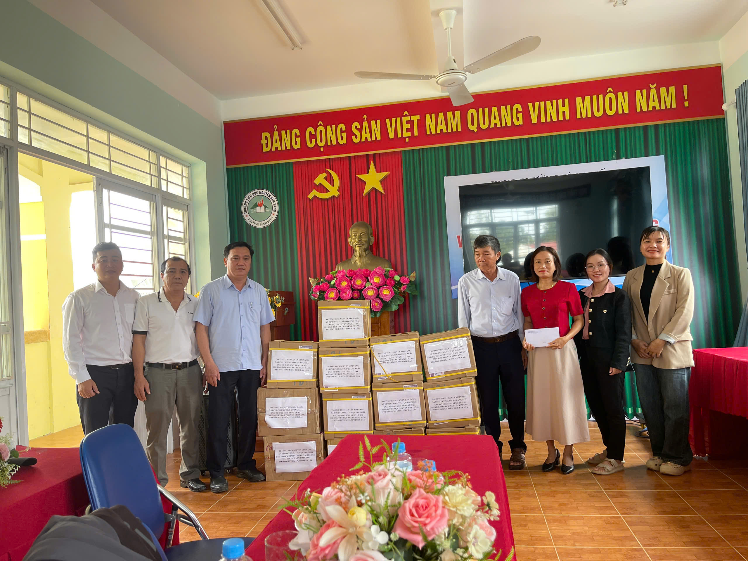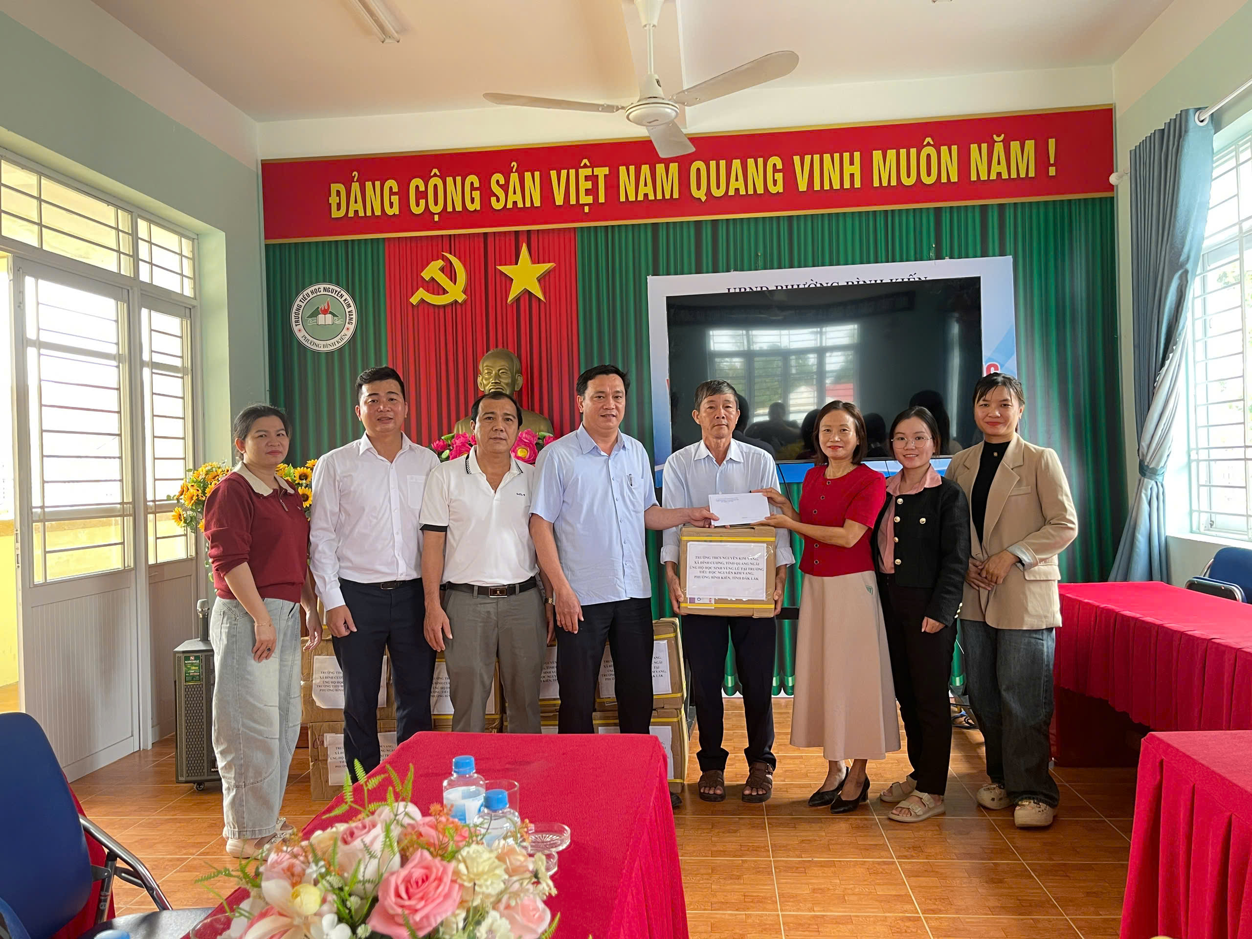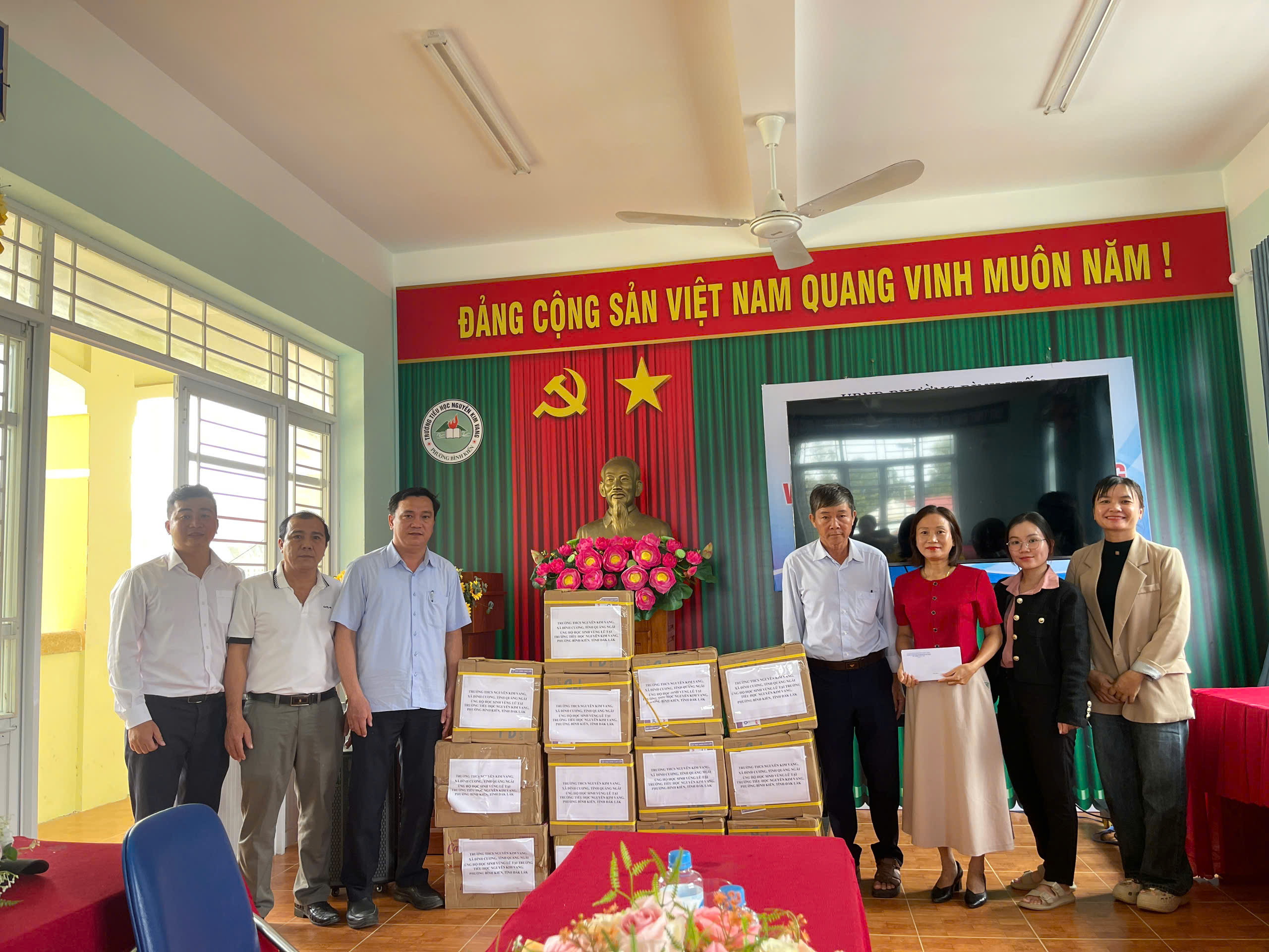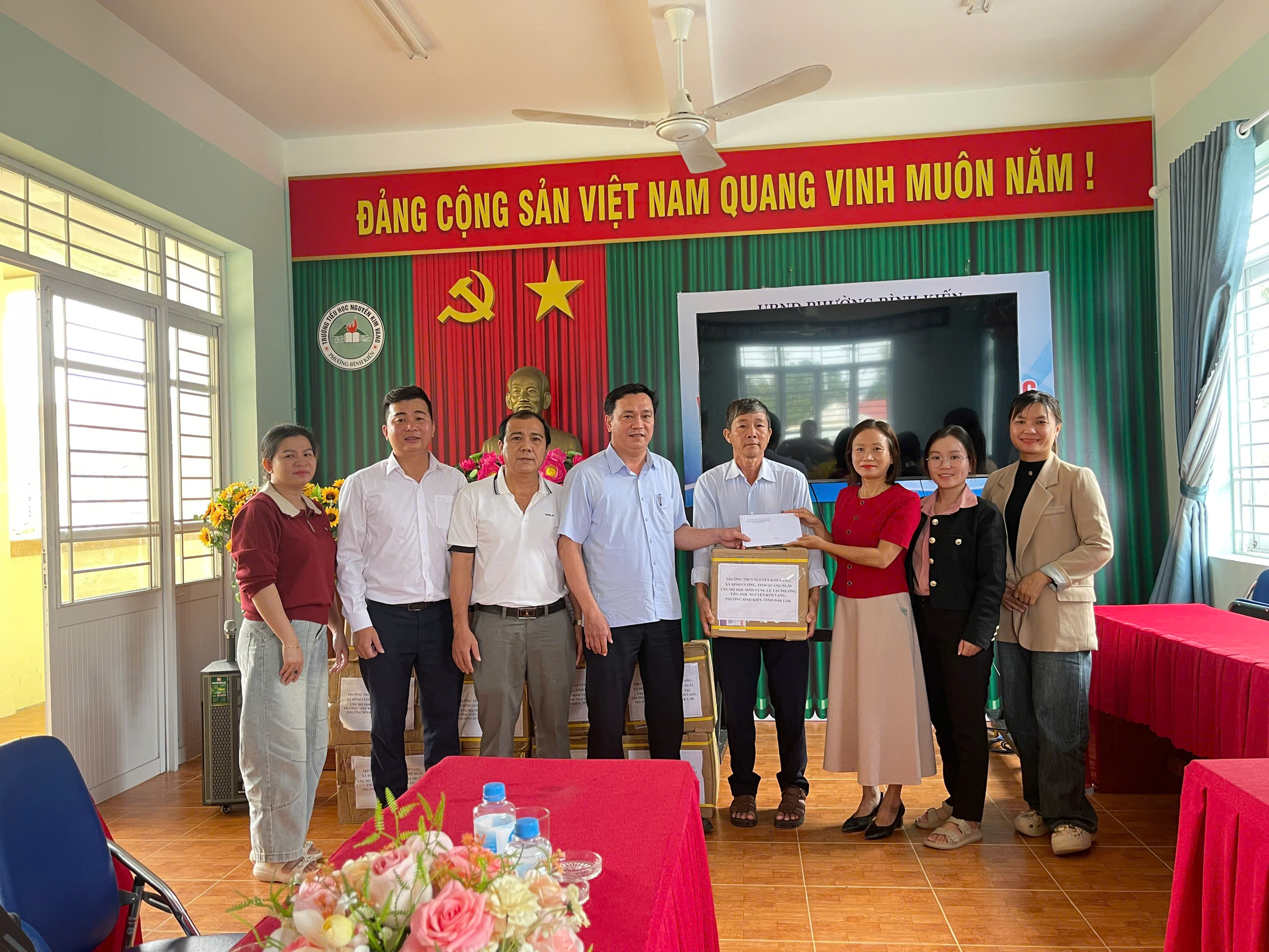 Sáng ngày 28/11/2025 đại diện lãnh đạo nhà trường, thầy giáo Đỗ Đình Thanh làm trưởng đoàn cùng thầy cô giáo của nhà trường đã đến dâng hương Liệt sĩ – AHLLVT CAND Nguyễn Kim Vang và trao quà cho học sinh bị ảnh hưởng do lũ lụt tại trường Tiểu học Nguyễn Kim Vang, Phường Bình Kiến, tỉnh Đăk Lắc (Phú Yên cũ). Tổng số quà được trao gồm vở, viết và tiền mặt là 15.400.000 đ do CBGVNV, PHHS và câu lạc bộ hưu trí của trường THCS Nguyễn Kim Vang, xã Đình Cương, tỉnh Quảng Ngãi quyên góp. Đây là món quà thể hiện tình cảm của thầy cô giáo và các em học sinh, mong các em học sinh bị ảnh hưởng do lũ lụt cố gắng vượt qua khó khăn, ổn định cuộc sống và cắp sách đến trường, thể hiện tinh thần tương thân tương ái “Lá lành đùm lá rách”, kết nghĩa gắn kết giữa hai đơn vị. Kính chúc thầy cô giáo và các em học sinh trường TH Nguyễn Kim Vang (Phường Bình Kiến, tỉnh Đăk Lắc (Phú Yên cũ)) luôn luôn mạnh khỏe, ổn định cuộc sống và hoàn thành xuất sắc nhiệm vụ năm học 2025 – 2026.