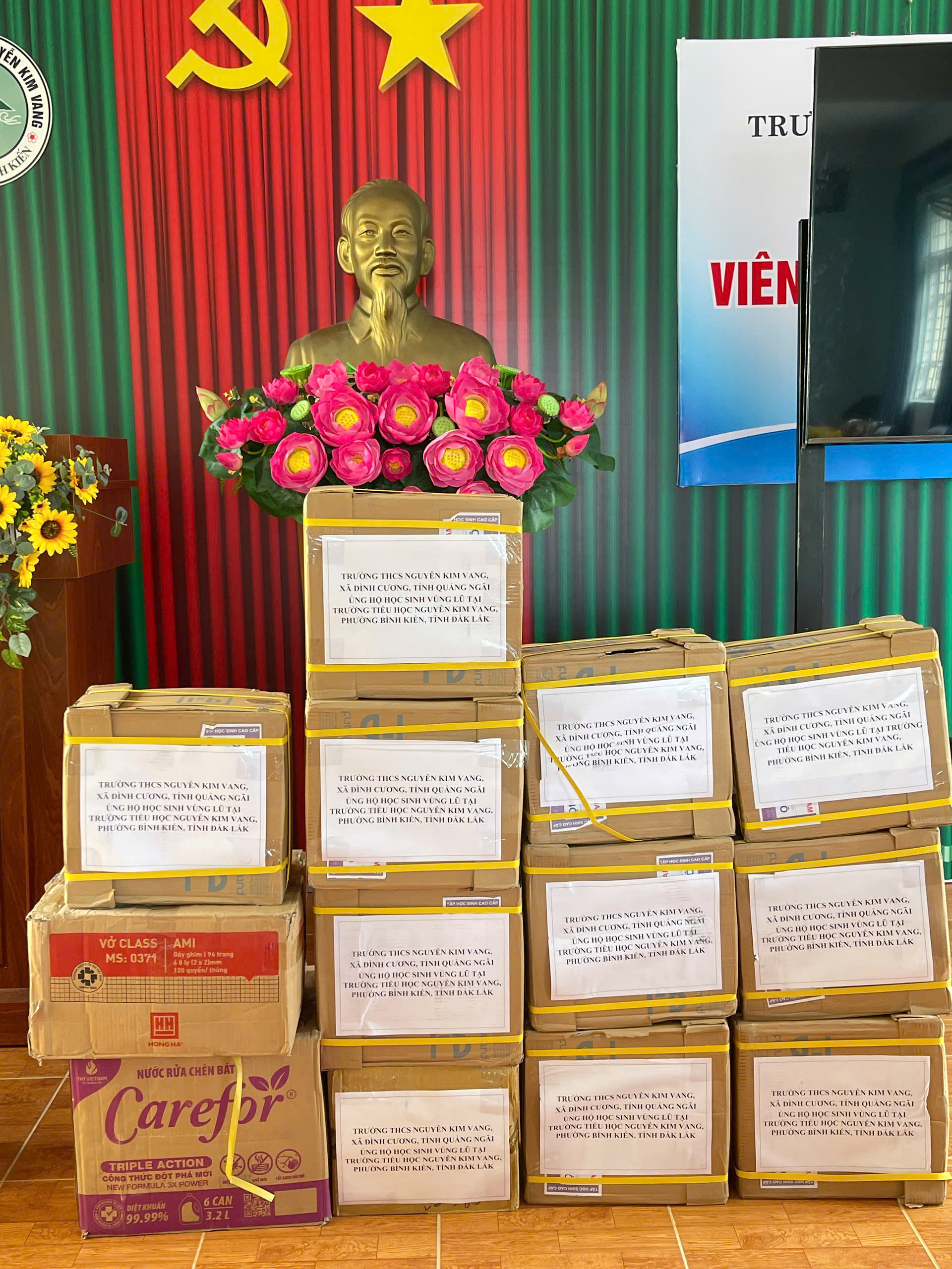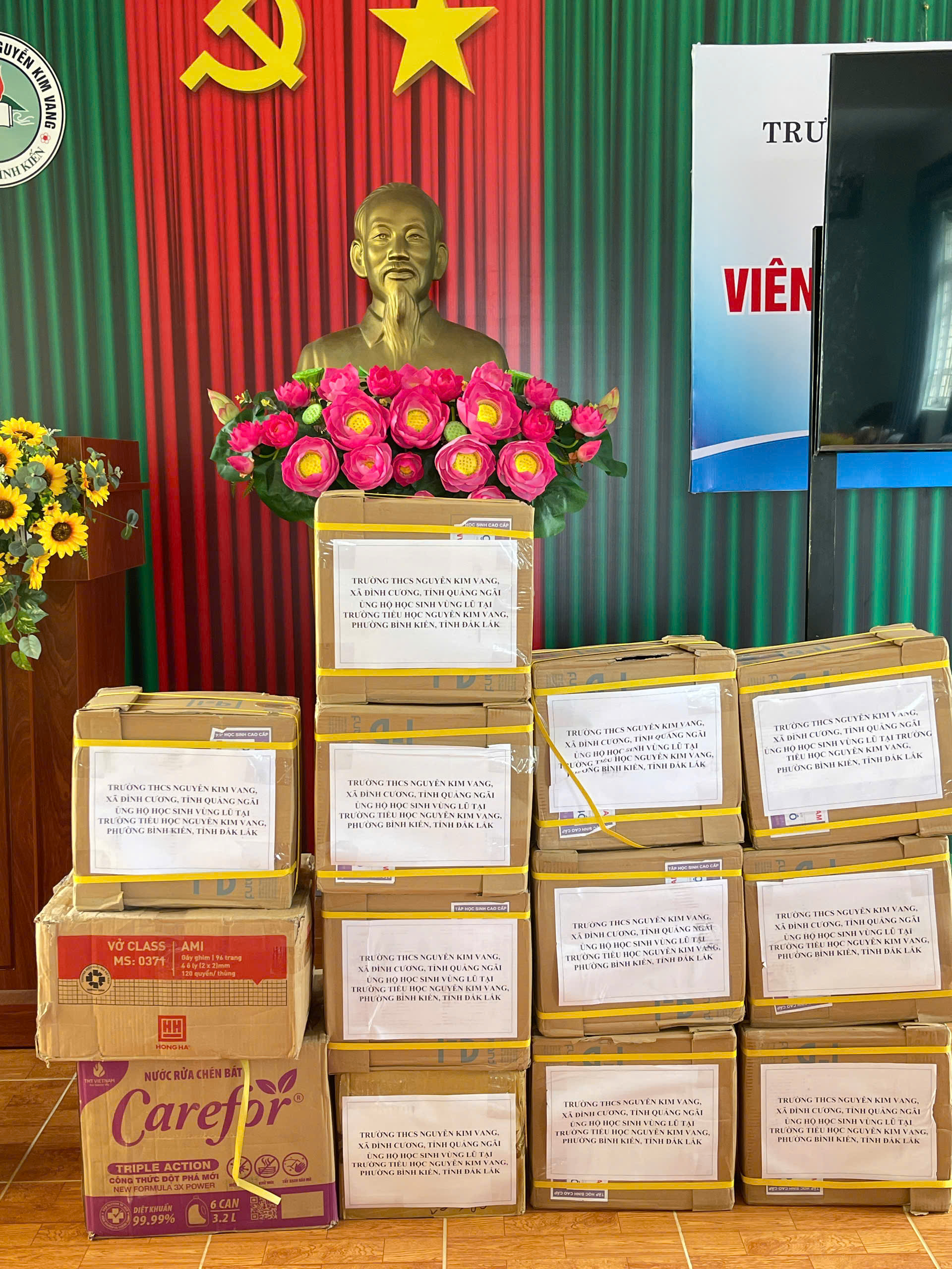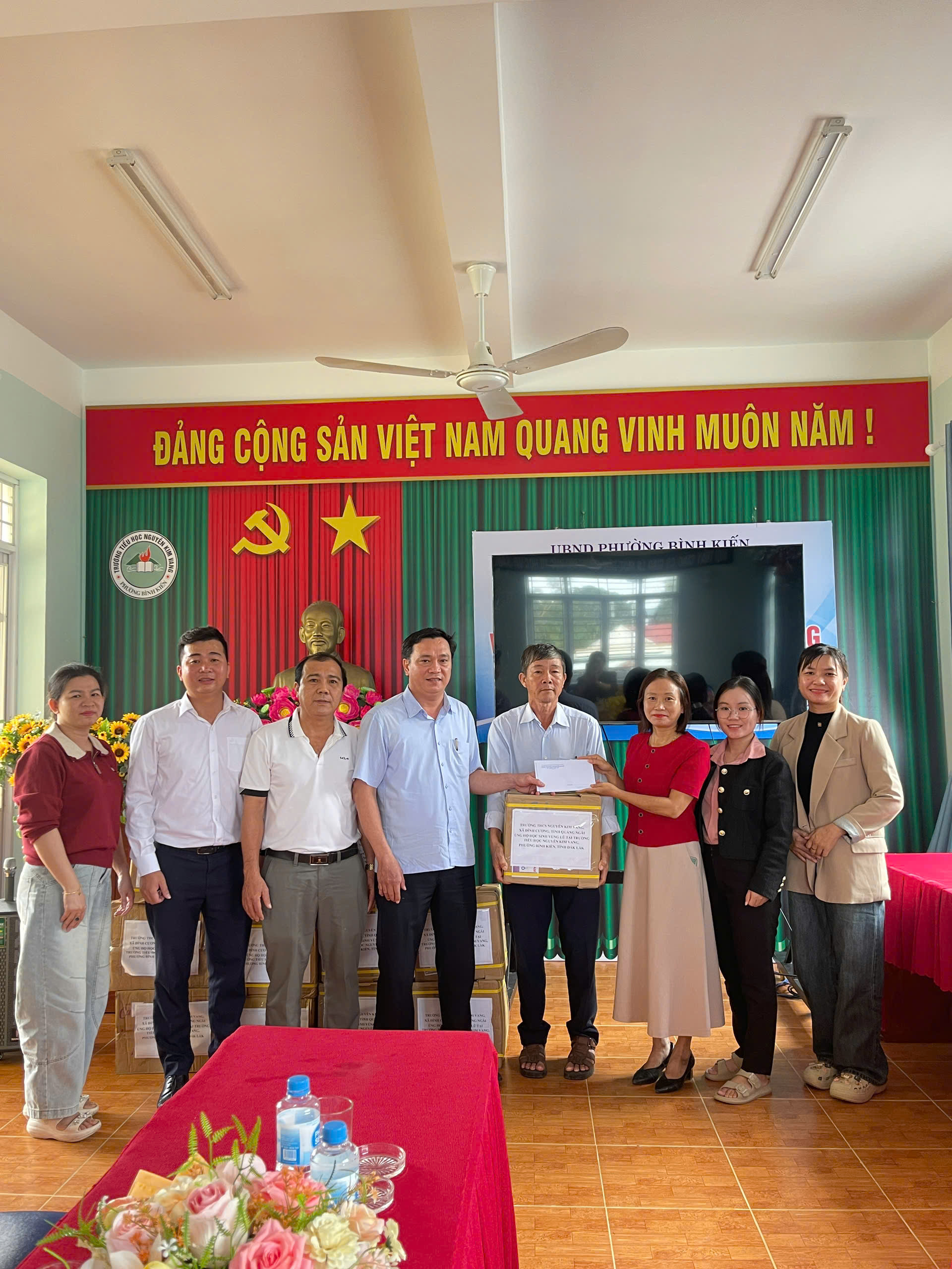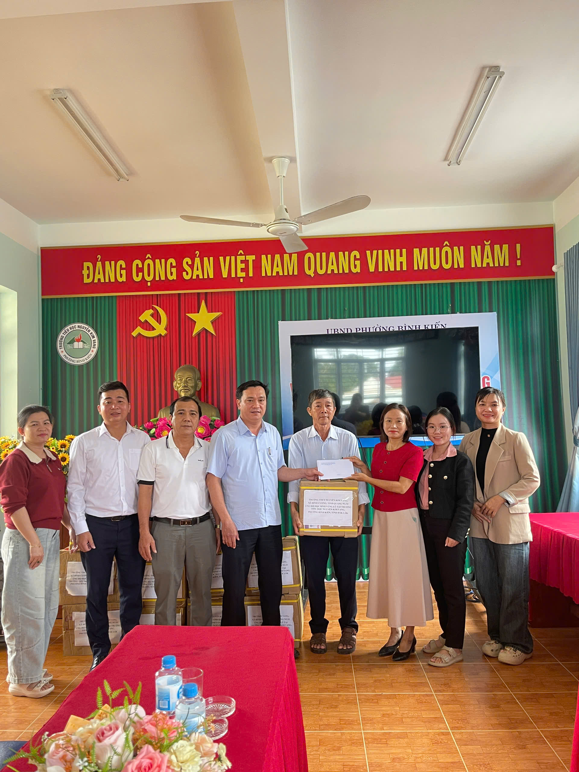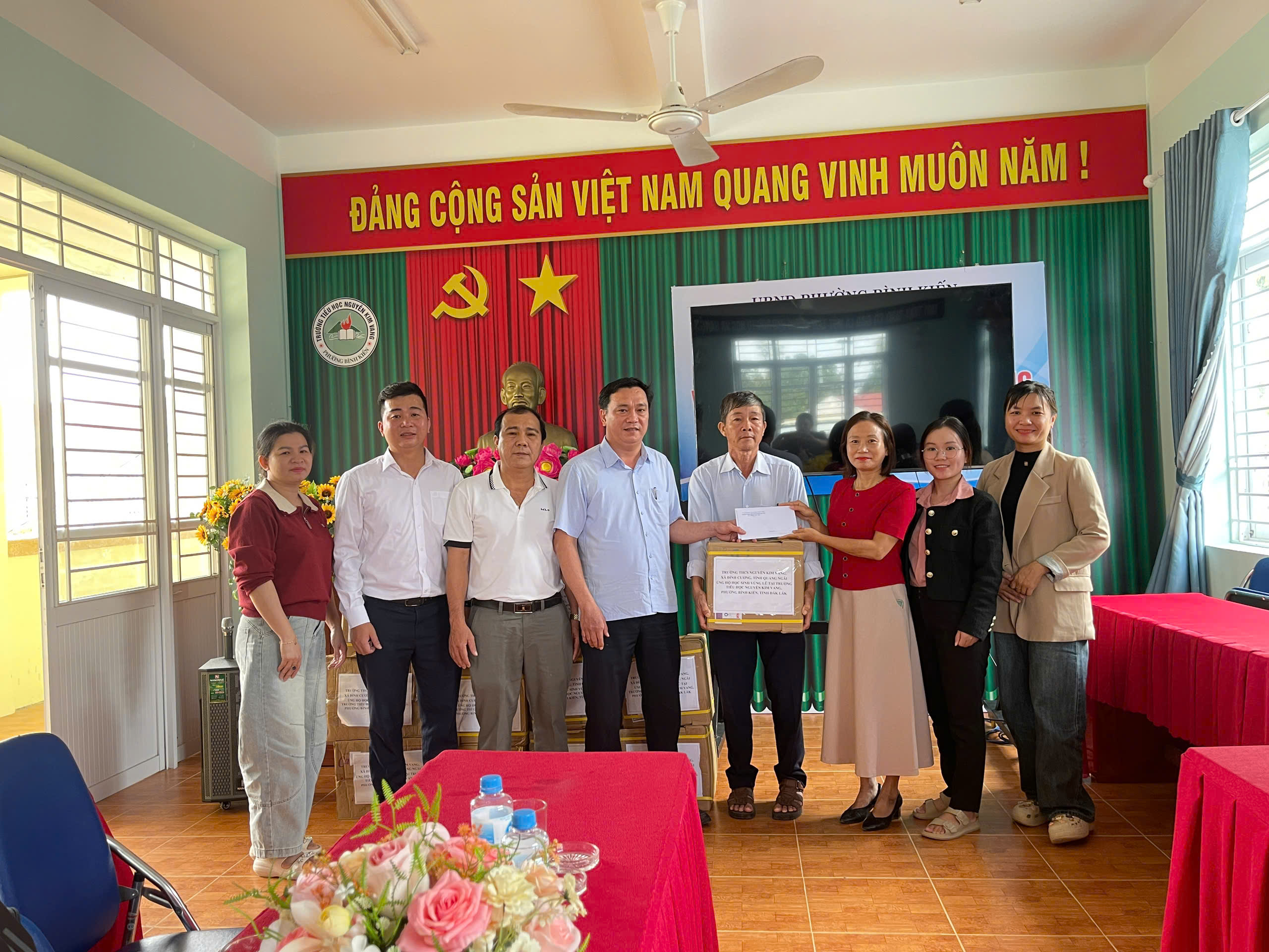 Sáng ngày 28/11/2025 đại diện lãnh đạo nhà trường, thầy giáo Đỗ Đình Thanh làm trưởng đoàn cùng thầy cô giáo của nhà trường đã đến dâng hương Liệt sĩ – AHLLVT CAND Nguyễn Kim Vang và trao quà cho học sinh bị ảnh hưởng do lũ lụt tại trường Tiểu học Nguyễn Kim Vang, Phường Bình Kiến, tỉnh Đăk Lắc (Phú Yên cũ). Tổng số quà được trao gồm vở, viết và tiền mặt là 15.400.000 đ do CBGVNV, PHHS và câu lạc bộ hưu trí của trường THCS Nguyễn Kim Vang, xã Đình Cương, tỉnh Quảng Ngãi quyên góp. Đây là món quà thể hiện tình cảm của thầy cô giáo và các em học sinh, mong các em học sinh bị ảnh hưởng do lũ lụt cố gắng vượt qua khó khăn, ổn định cuộc sống và cắp sách đến trường, thể hiện tinh thần tương thân tương ái “Lá lành đùm lá rách”, kết nghĩa gắn kết giữa hai đơn vị. Kính chúc thầy cô giáo và các em học sinh trường TH Nguyễn Kim Vang (Phường Bình Kiến, tỉnh Đăk Lắc (Phú Yên cũ)) luôn luôn mạnh khỏe, ổn định cuộc sống và hoàn thành xuất sắc nhiệm vụ năm học 2025 – 2026.