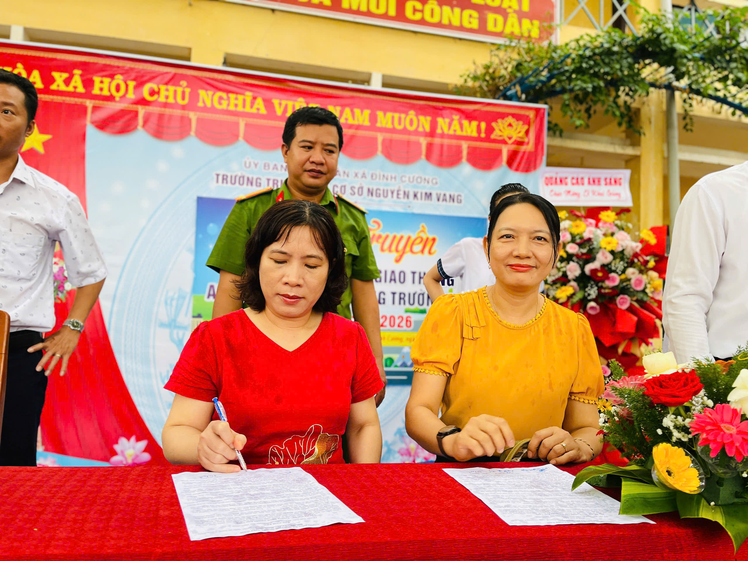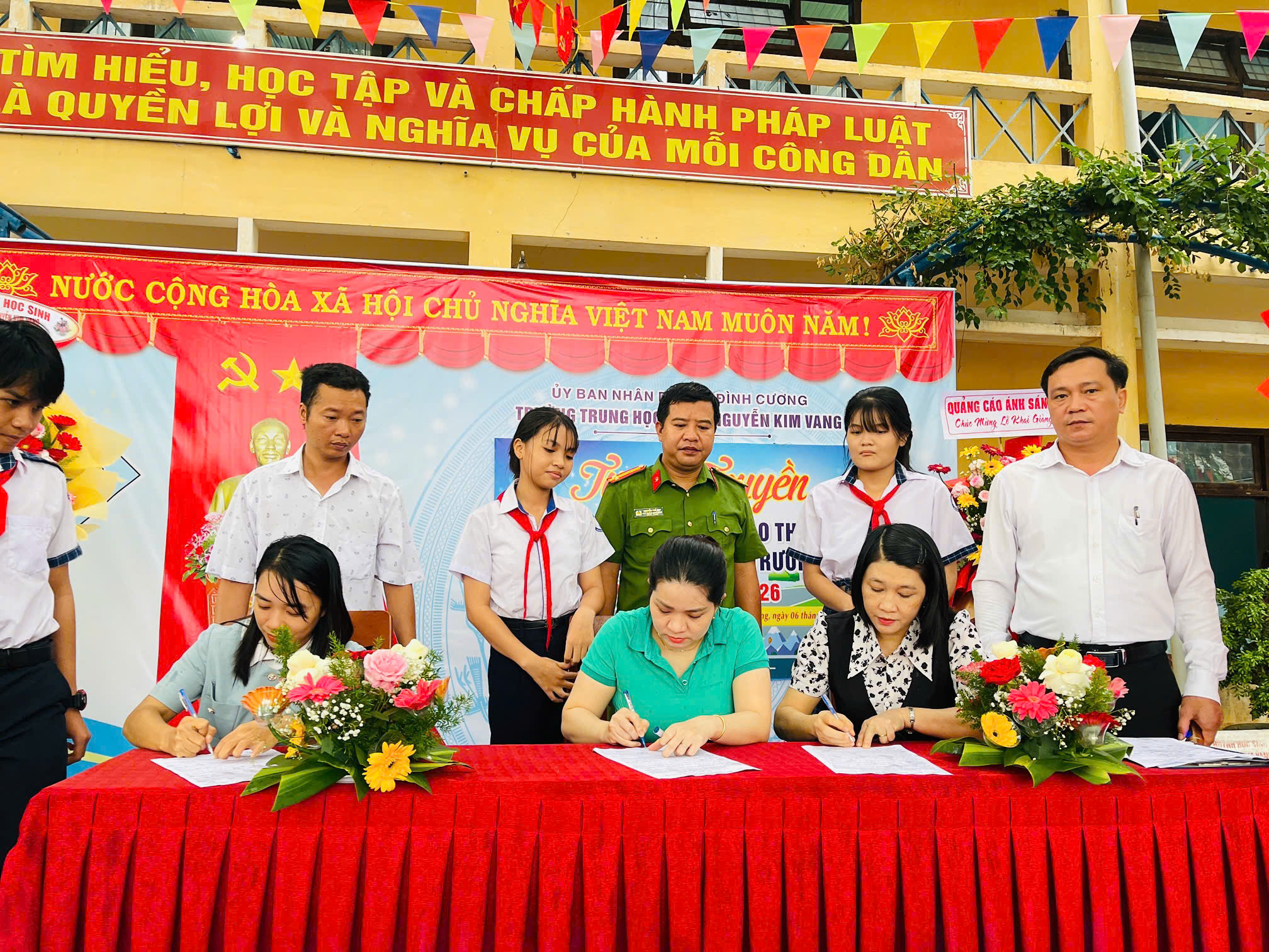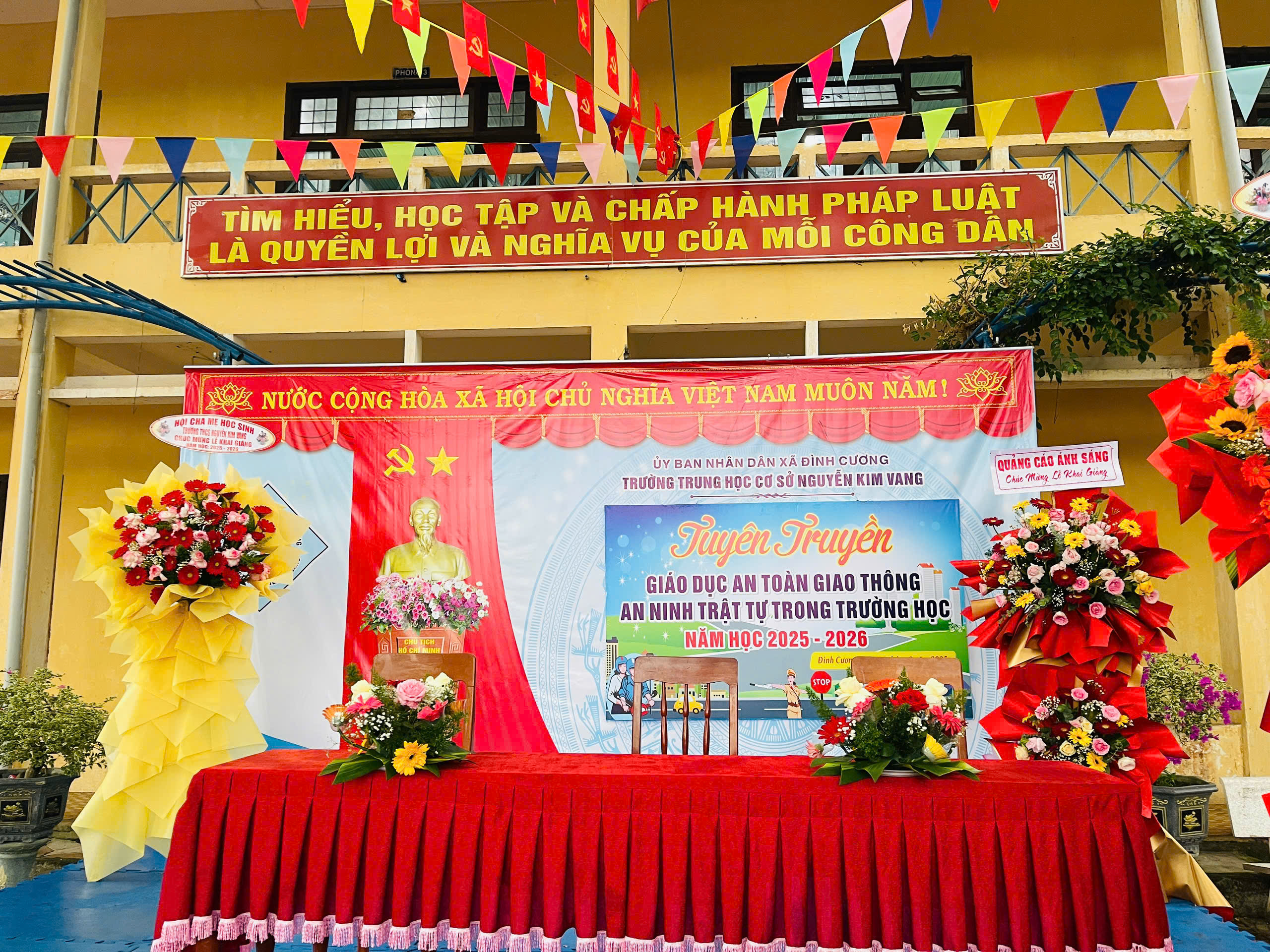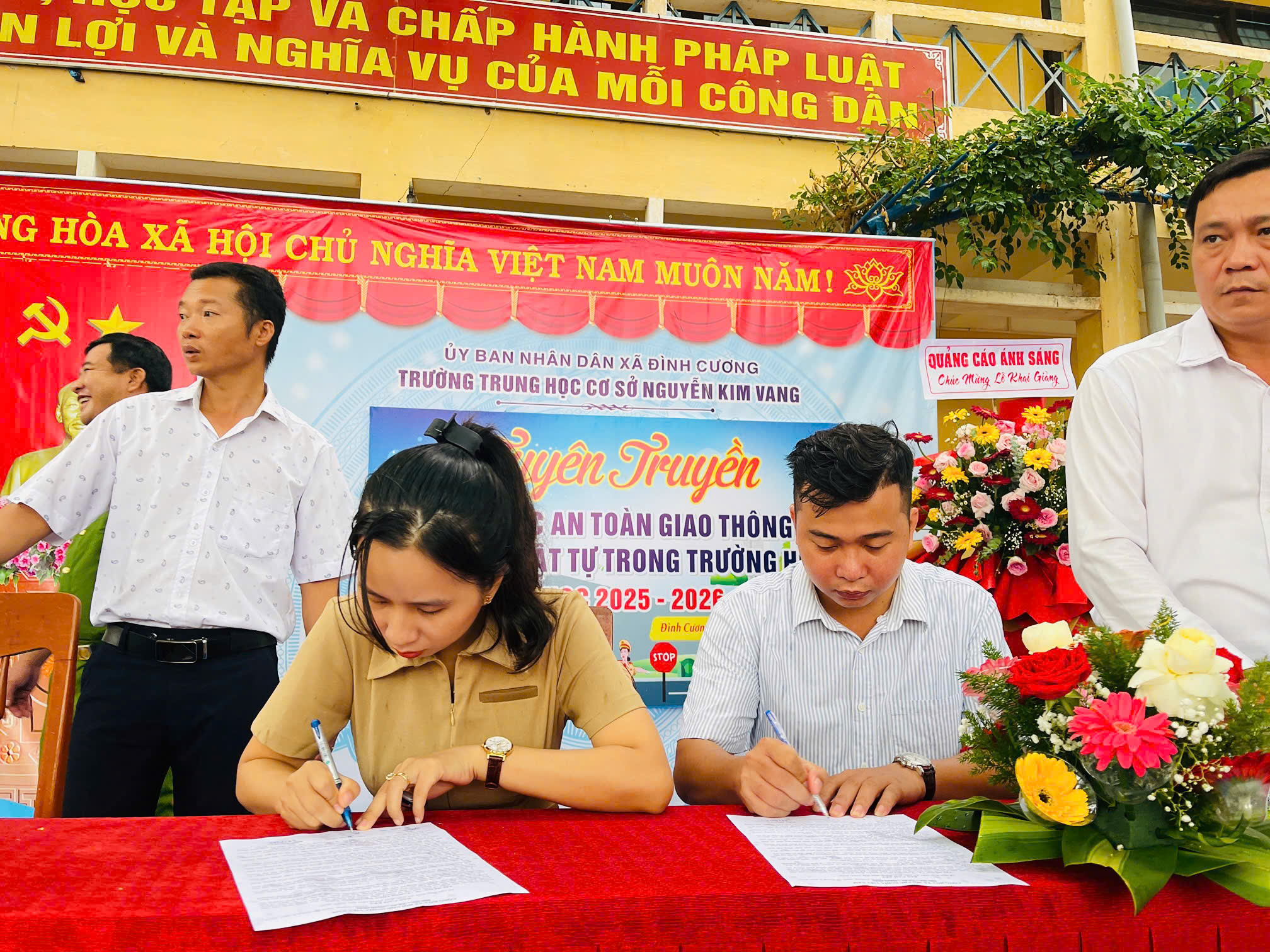 Thực hiện kế hoạch năm học 2025-2026, chỉ đạo của Sở GD&ĐT tỉnh Quảng Ngãi, UBND xã Đình Cương về việc phối hợp tuyên truyền giáo dục ATGT, ANTT trong trường học năm học 2025 – 2026. Sáng ngày 06/9/2025 tại trường THCS Nguyễn Kim Vang tiến hành tổ chức buổi tuyên truyền. Về dự và báo cáo buổi tuyên truyền có đ/c Nguyễn Thế Duy – Phó trưởng công an xã Đình Cương, về phía nhà trường có Thầy giáo Đỗ Đình Thanh – Bí thư chi bộ – Hiệu trưởng nhà trường, tất cả CBGVNV và 386 học sinh toàn trường tham gia. Trong buổi tuyên truyền tất cả CBGVNV và các em học sinh được nghe đ/c Nguyễn Thế Duy – Phó trưởng công an xã Đình Cương báo cáo các chuyên đề về ATGT, ANTT, bạo lực học đường và công tác PCCC. Cuối buổi tuyên truyền nhà trường cho 11 GVCN và lớp trưởng của 11 lớp kí cam kết về thực hiện tốt ATGT, ANTT và nội quy nhà trường. Qua buổi tuyên truyền giúp các em học sinh hiểu hơn về luật giao thông đường bộ mới nhất, các quy định về công tác an ninh trật tự, những quy định mà học sinh không được làm.