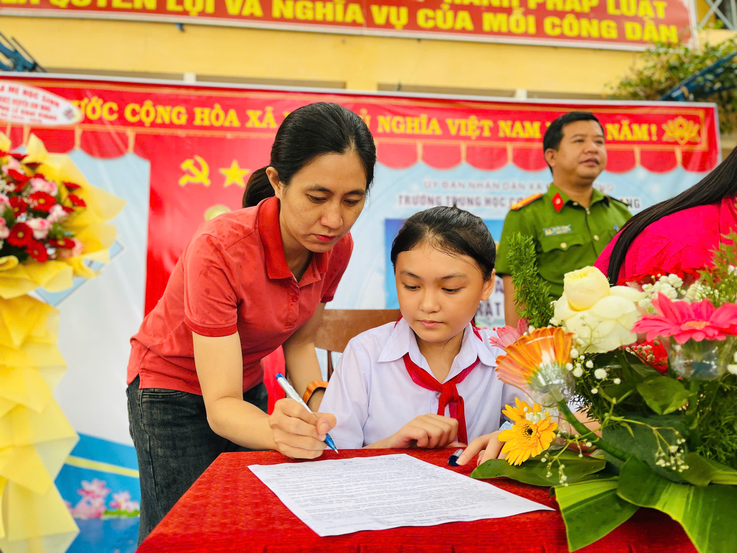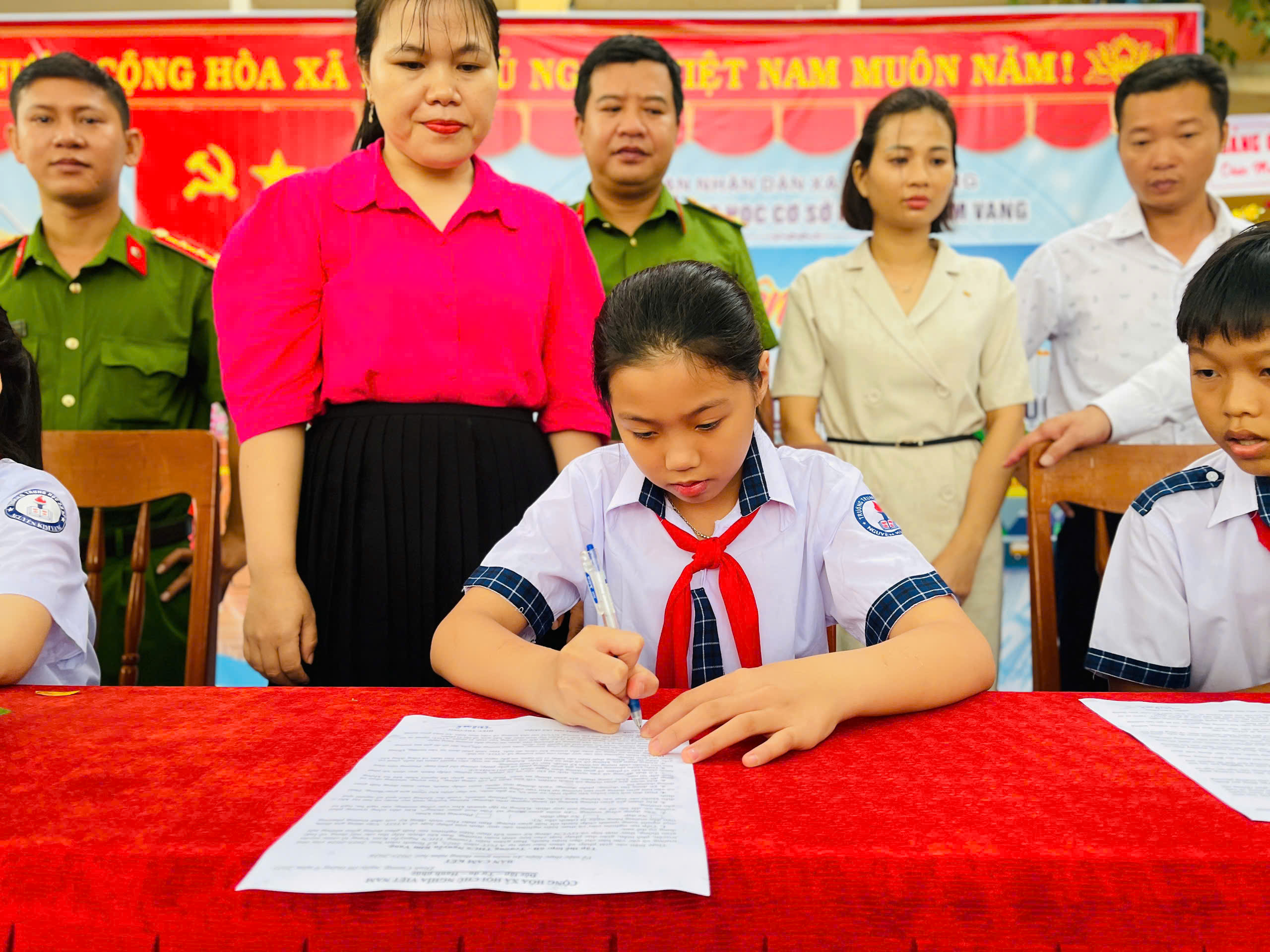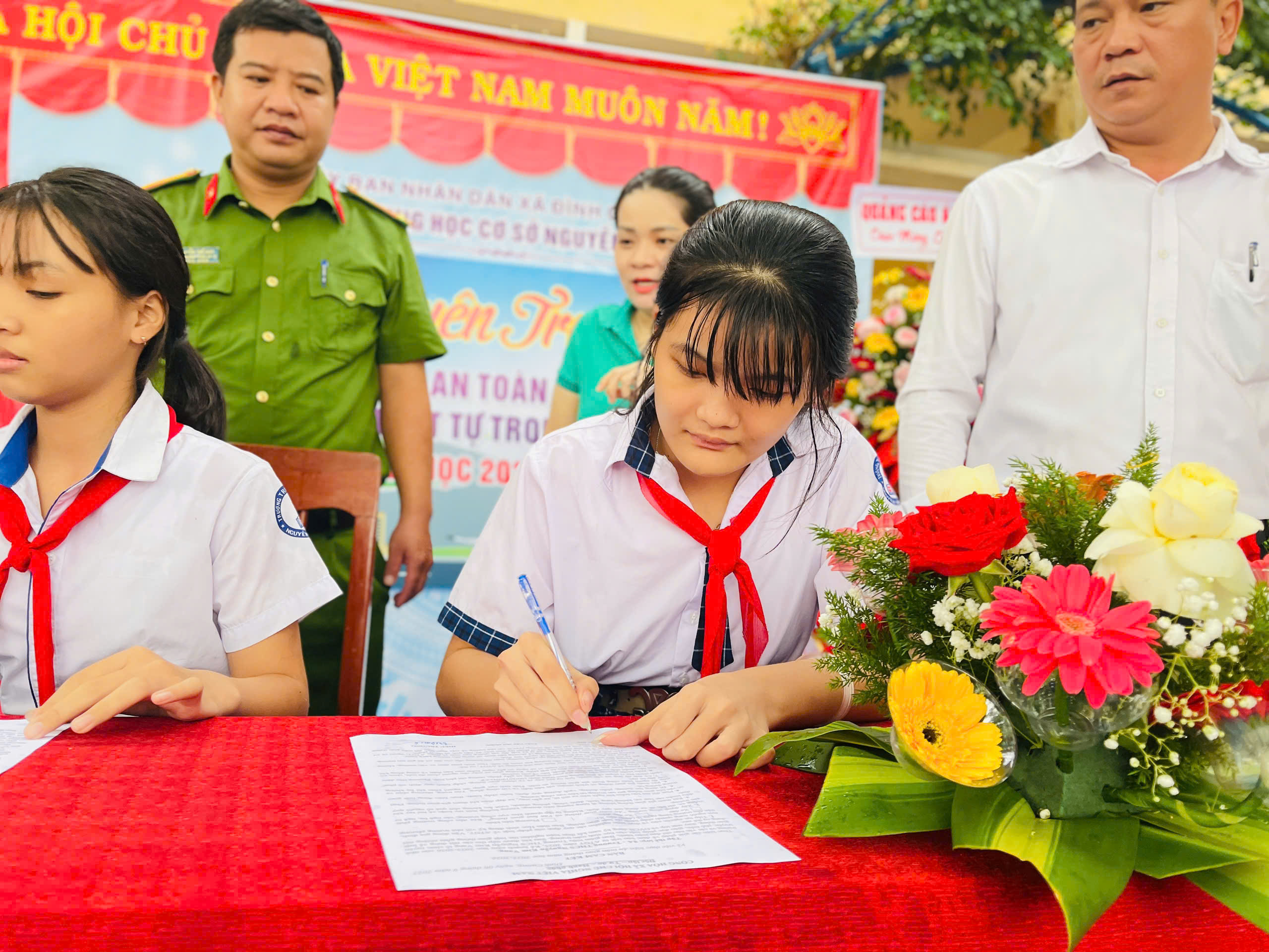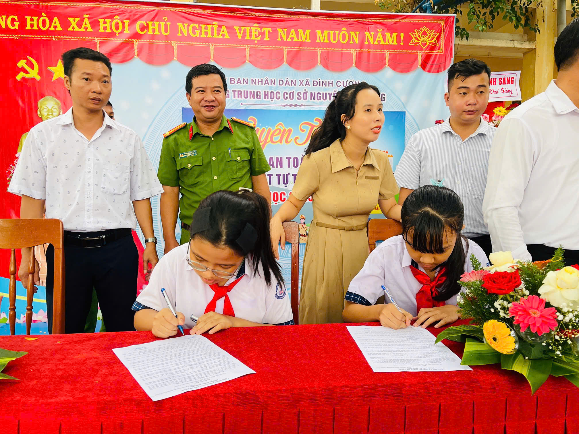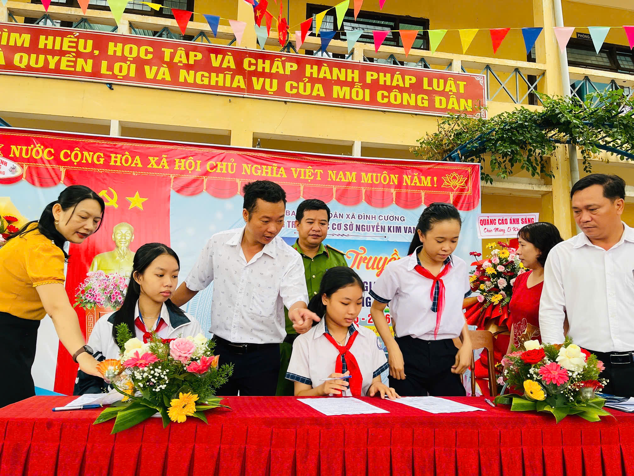 Thực hiện kế hoạch năm học 2025-2026, chỉ đạo của Sở GD&ĐT tỉnh Quảng Ngãi, UBND xã Đình Cương về việc phối hợp tuyên truyền giáo dục ATGT, ANTT trong trường học năm học 2025 – 2026. Sáng ngày 06/9/2025 tại trường THCS Nguyễn Kim Vang tiến hành tổ chức buổi tuyên truyền. Về dự và báo cáo buổi tuyên truyền có đ/c Nguyễn Thế Duy – Phó trưởng công an xã Đình Cương, về phía nhà trường có Thầy giáo Đỗ Đình Thanh – Bí thư chi bộ – Hiệu trưởng nhà trường, tất cả CBGVNV và 386 học sinh toàn trường tham gia. Trong buổi tuyên truyền tất cả CBGVNV và các em học sinh được nghe đ/c Nguyễn Thế Duy – Phó trưởng công an xã Đình Cương báo cáo các chuyên đề về ATGT, ANTT, bạo lực học đường và công tác PCCC. Cuối buổi tuyên truyền nhà trường cho 11 GVCN và lớp trưởng của 11 lớp kí cam kết về thực hiện tốt ATGT, ANTT và nội quy nhà trường. Qua buổi tuyên truyền giúp các em học sinh hiểu hơn về luật giao thông đường bộ mới nhất, các quy định về công tác an ninh trật tự, những quy định mà học sinh không được làm.