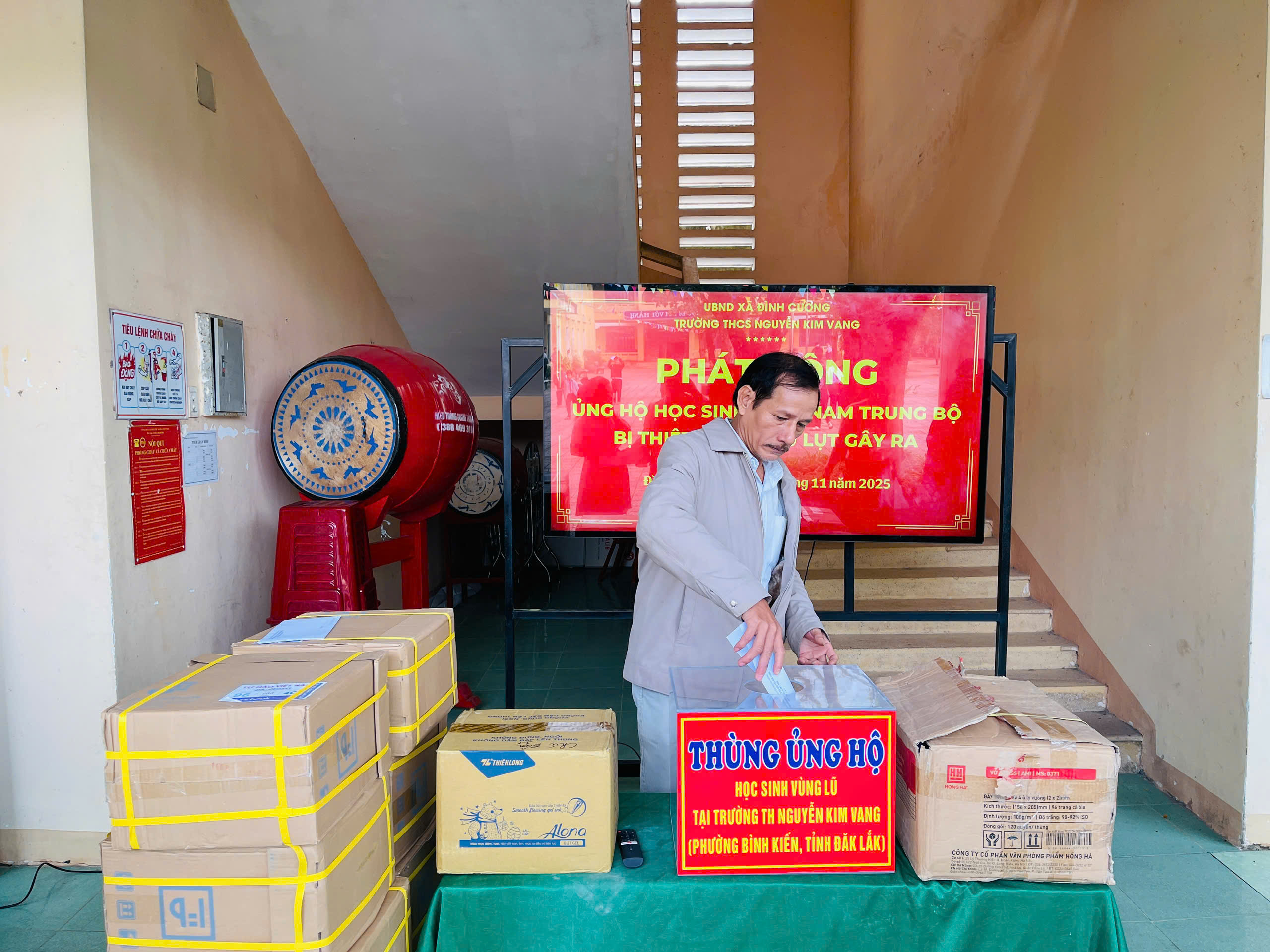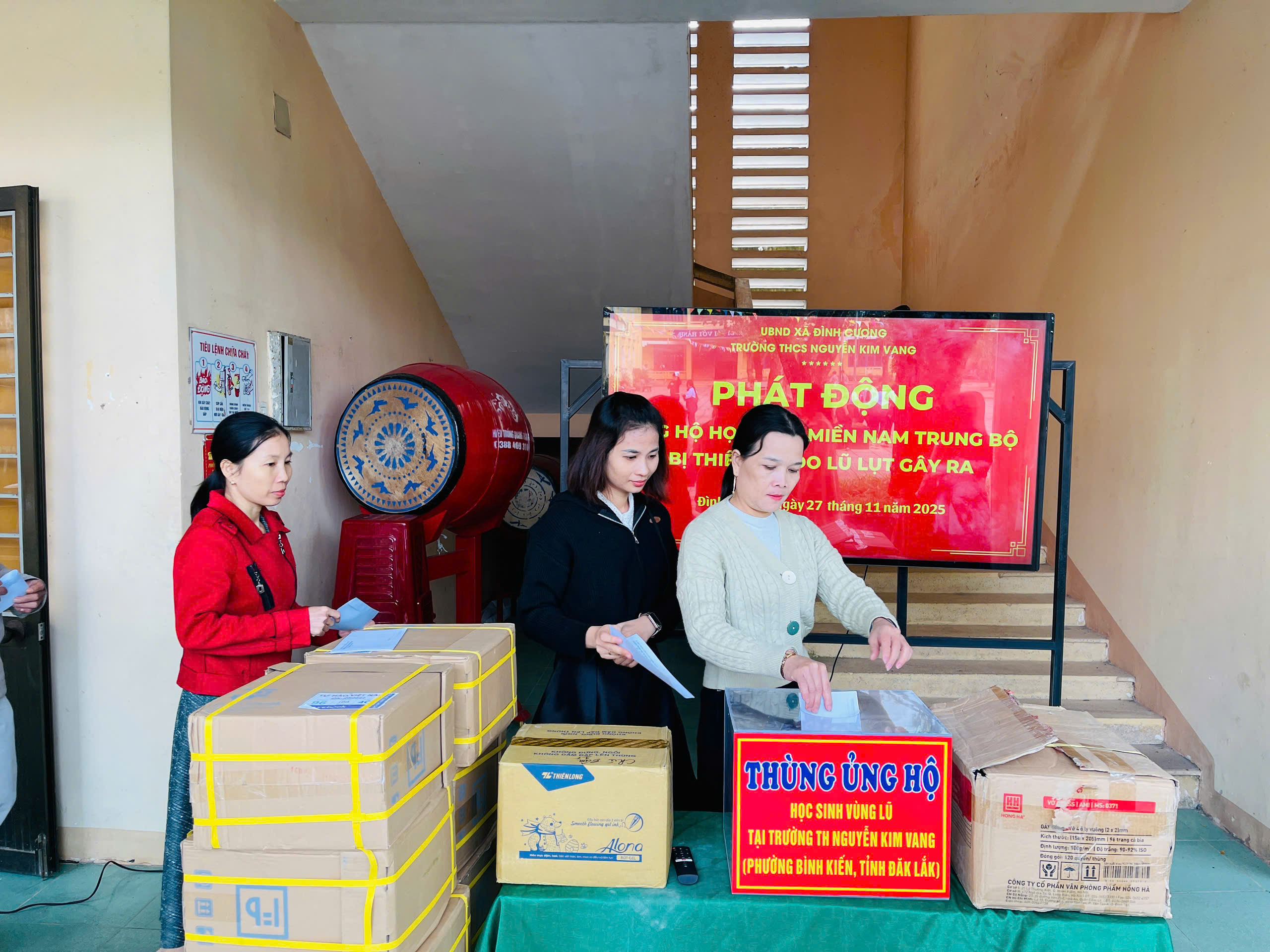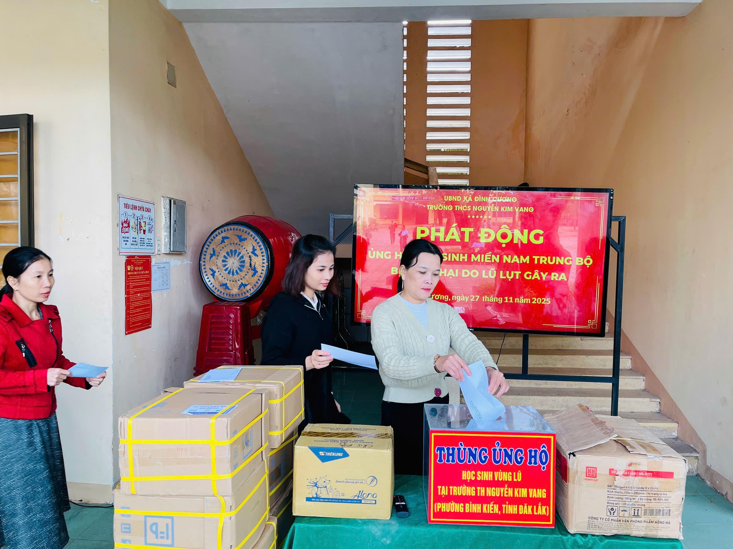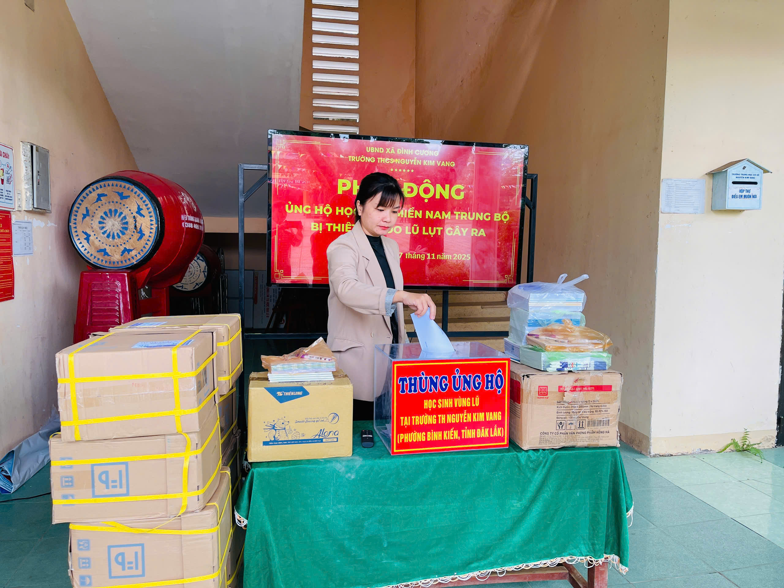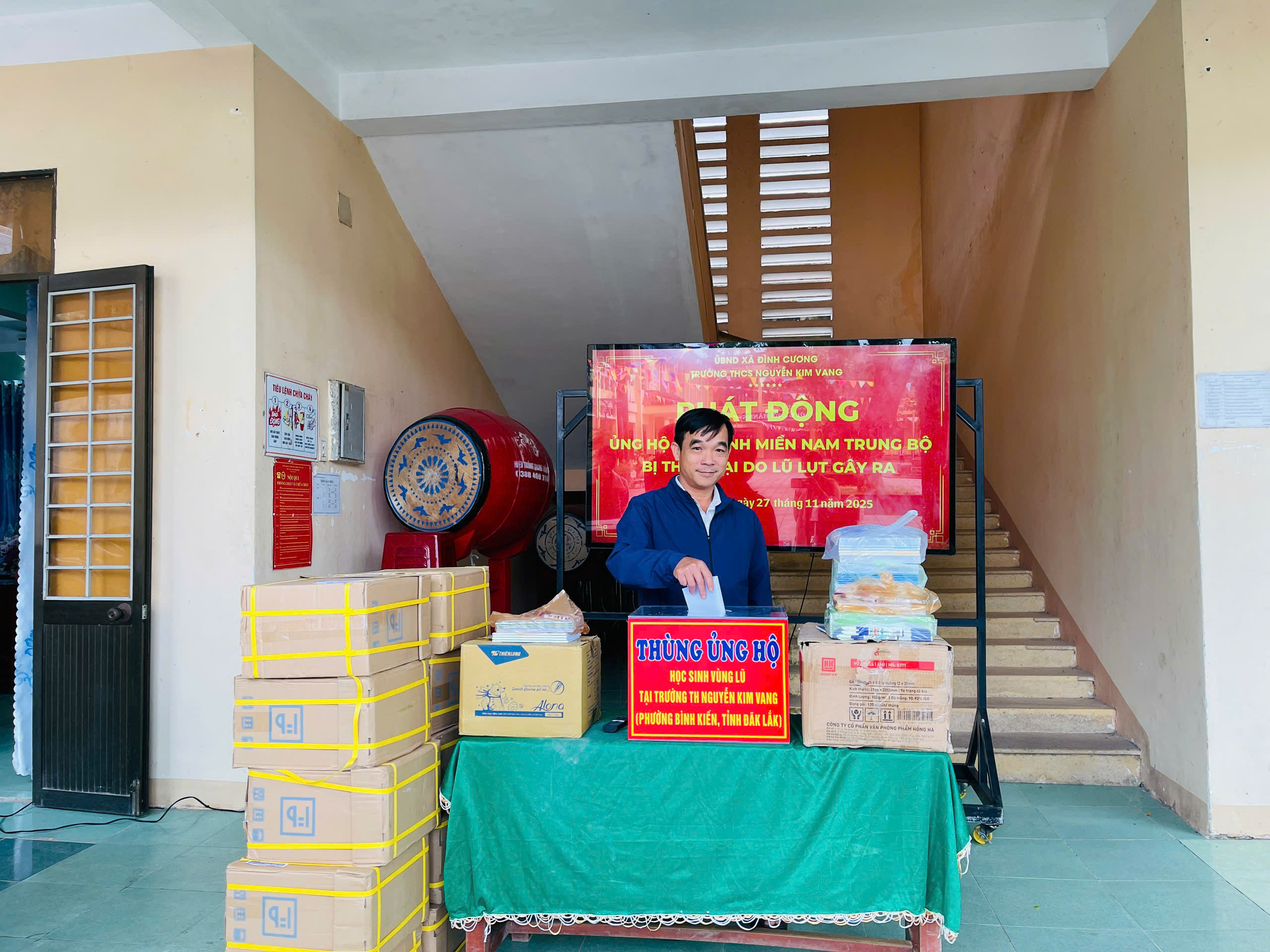 Thực hiện thư kêu gọi của UBMTTQ Việt Nam xã Đình Cương về việc ủng hộ đồng bào các tỉnh nam trung bộ bị ảnh hưởng do lũ lụt gây ra. Với tinh thần tương thân, tương ái ” Lá lành đùm lá rách”. Từ ngày 25/11 đến 27/11/2025 trường THCS Nguyễn Kim Vang tổ chức Lễ phát động và tổng kết đợt quyên góp ủng các tỉnh nam trung bộ bị thiệt hại do lũ lụt gây ra. Với tổng cộng đợt huy động lần này là 15.444.000 đồng (trong đó: Câu lạc bộn hưu trí của trường ủng hộ 2.900.000đ; CBGVNV ủng hộ 6.000.000đ; PHHS 11 lớp ủng hộ vở + viết và tiền mặt là 6.544.000đ ). Tất cả vở, viết và tiền mặt nhà trường sẽ thành lập Đoàn và trao trực tiếp cho các em học sinh tại trường TH Nguyễn Kim Vang, Phường Bình Kiến, tỉnh Phú Yên(cũ) nay là tỉnh Đắc Lắc vào sáng ngày 28/11/2025. Thay lãnh đạo nhà trường xin ghi nhận tấm lòng chia sẻ yêu thương, đùm bọc nhau trong lúc khó khăn hoạn nạn của thầy cô giáo nghỉ hưu, CBGVNV nhà trường và toàn PHHS.