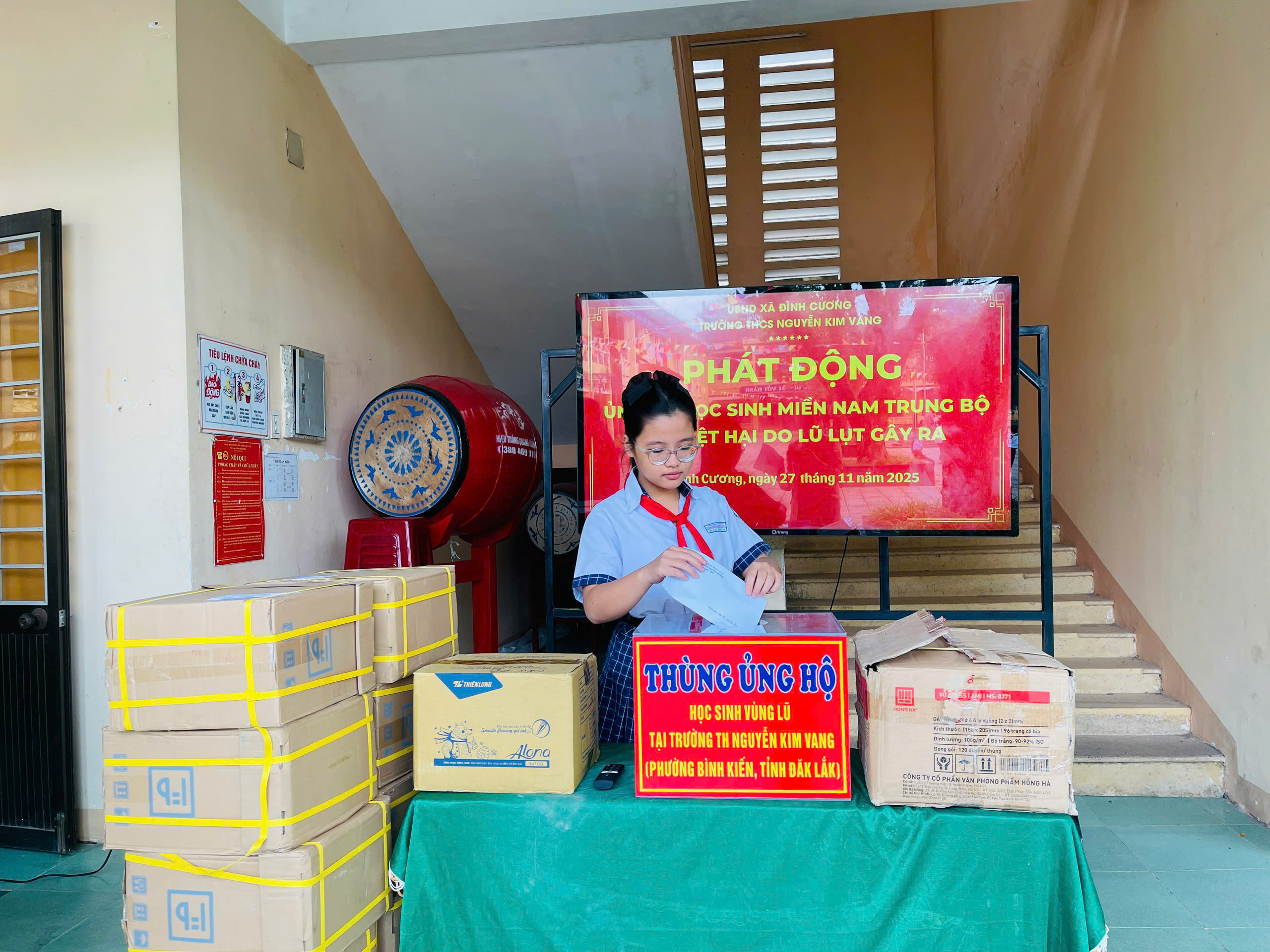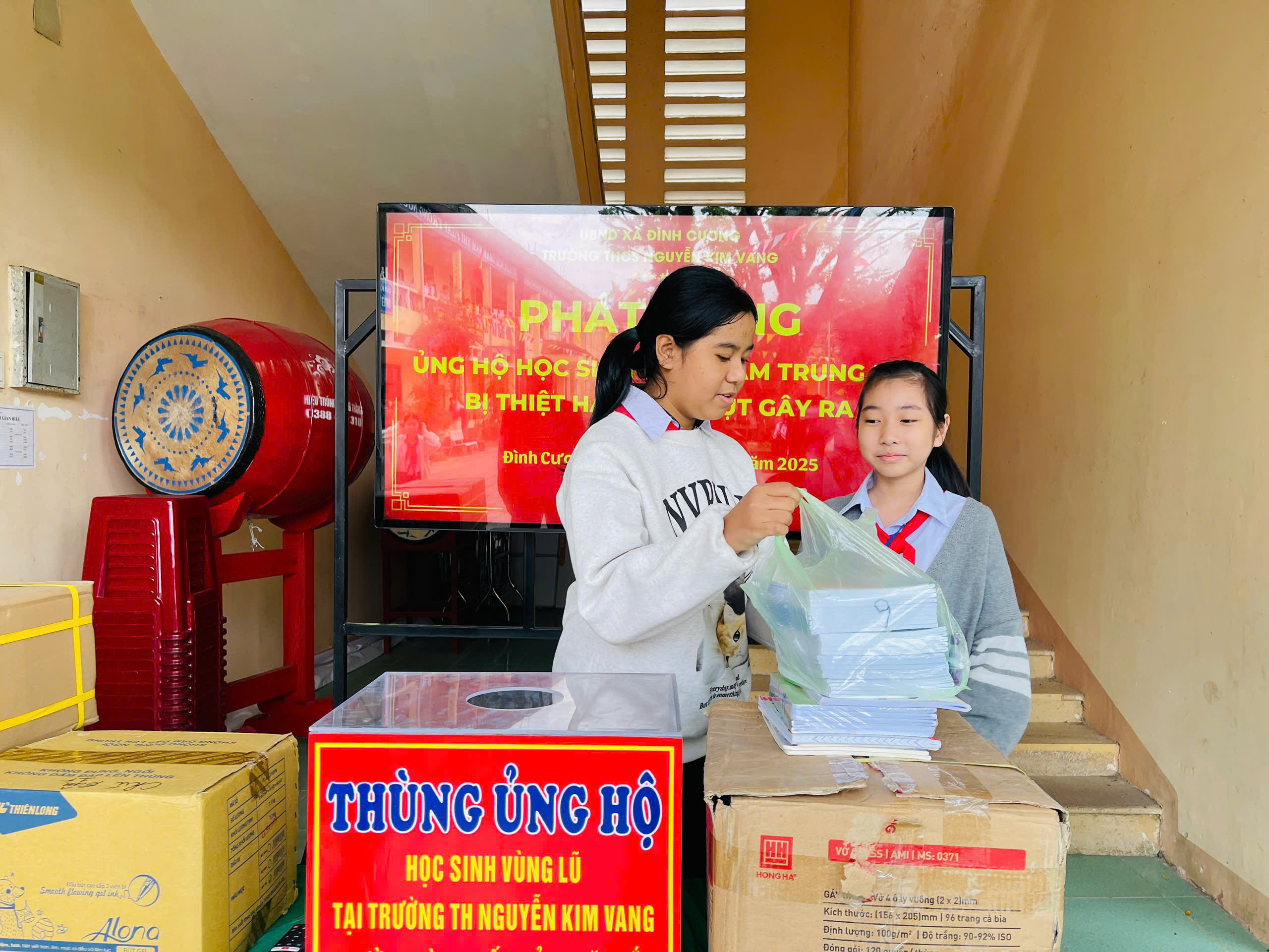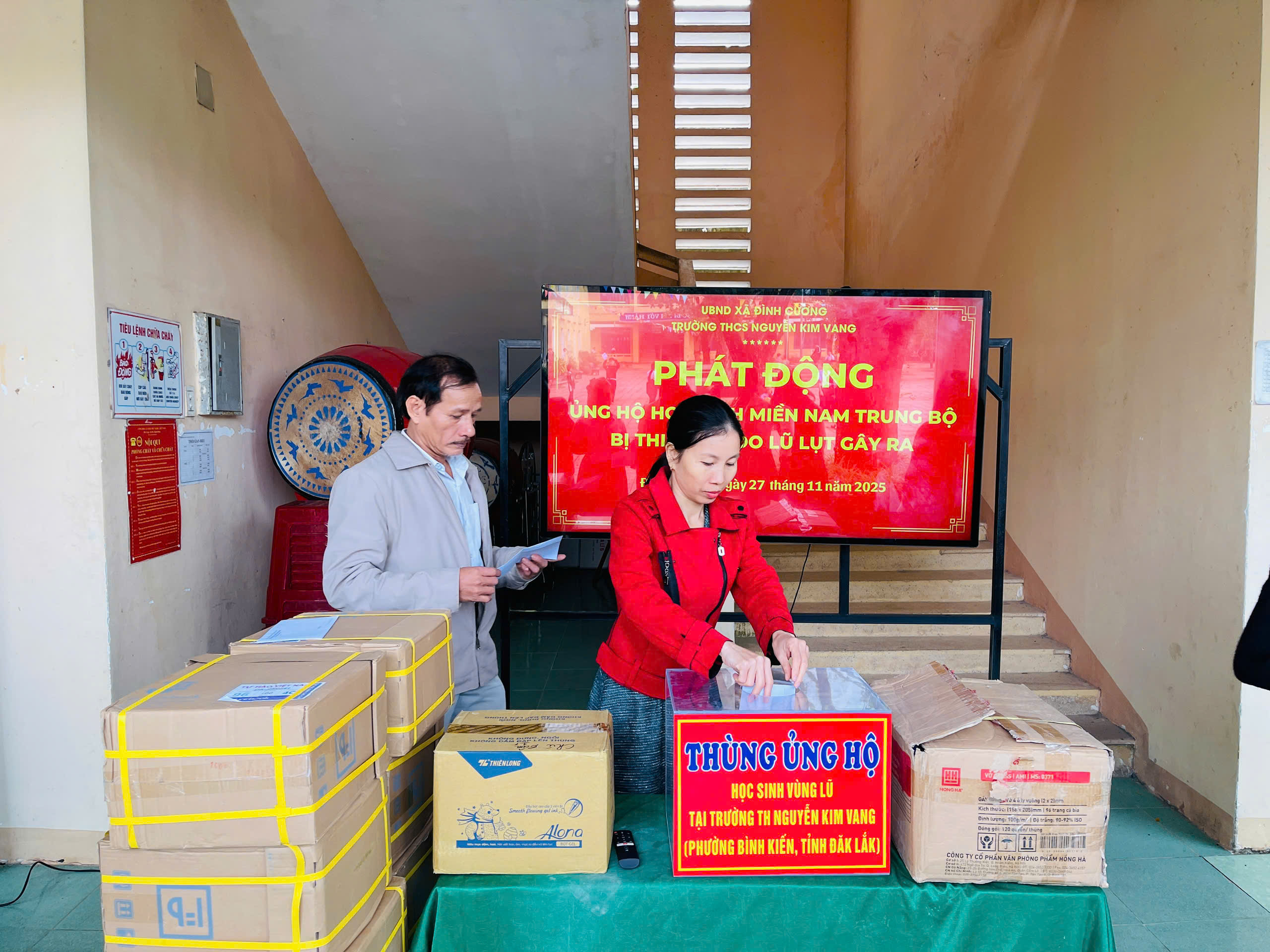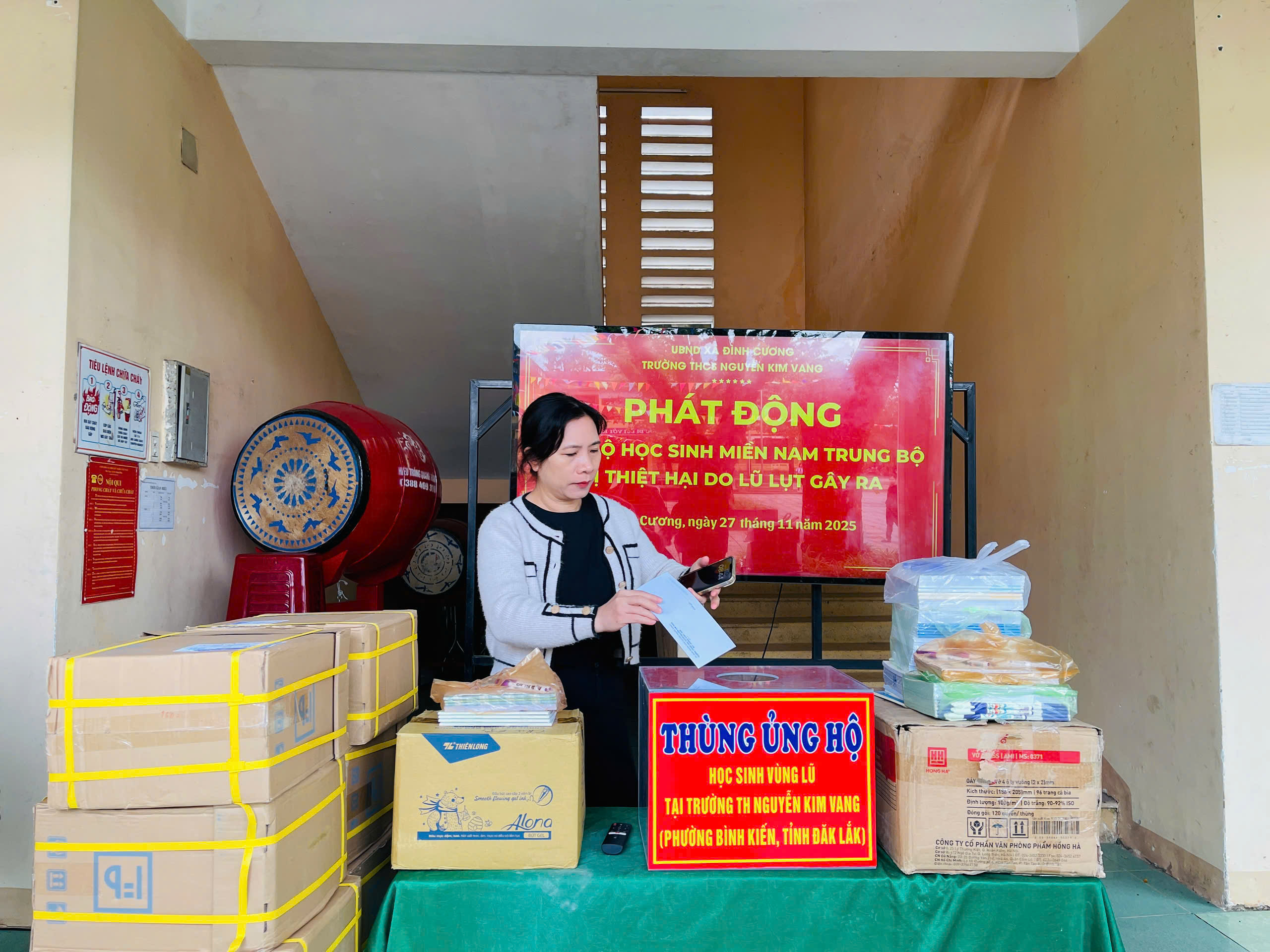 Thực hiện thư kêu gọi của UBMTTQ Việt Nam xã Đình Cương về việc ủng hộ đồng bào các tỉnh nam trung bộ bị ảnh hưởng do lũ lụt gây ra. Với tinh thần tương thân, tương ái ” Lá lành đùm lá rách”. Từ ngày 25/11 đến 27/11/2025 trường THCS Nguyễn Kim Vang tổ chức Lễ phát động và tổng kết đợt quyên góp ủng các tỉnh nam trung bộ bị thiệt hại do lũ lụt gây ra. Với tổng cộng đợt huy động lần này là 15.444.000 đồng (trong đó: Câu lạc bộn hưu trí của trường ủng hộ 2.900.000đ; CBGVNV ủng hộ 6.000.000đ; PHHS 11 lớp ủng hộ vở + viết và tiền mặt là 6.544.000đ ). Tất cả vở, viết và tiền mặt nhà trường sẽ thành lập Đoàn và trao trực tiếp cho các em học sinh tại trường TH Nguyễn Kim Vang, Phường Bình Kiến, tỉnh Phú Yên(cũ) nay là tỉnh Đắc Lắc vào sáng ngày 28/11/2025. Thay lãnh đạo nhà trường xin ghi nhận tấm lòng chia sẻ yêu thương, đùm bọc nhau trong lúc khó khăn hoạn nạn của thầy cô giáo nghỉ hưu, CBGVNV nhà trường và toàn PHHS.