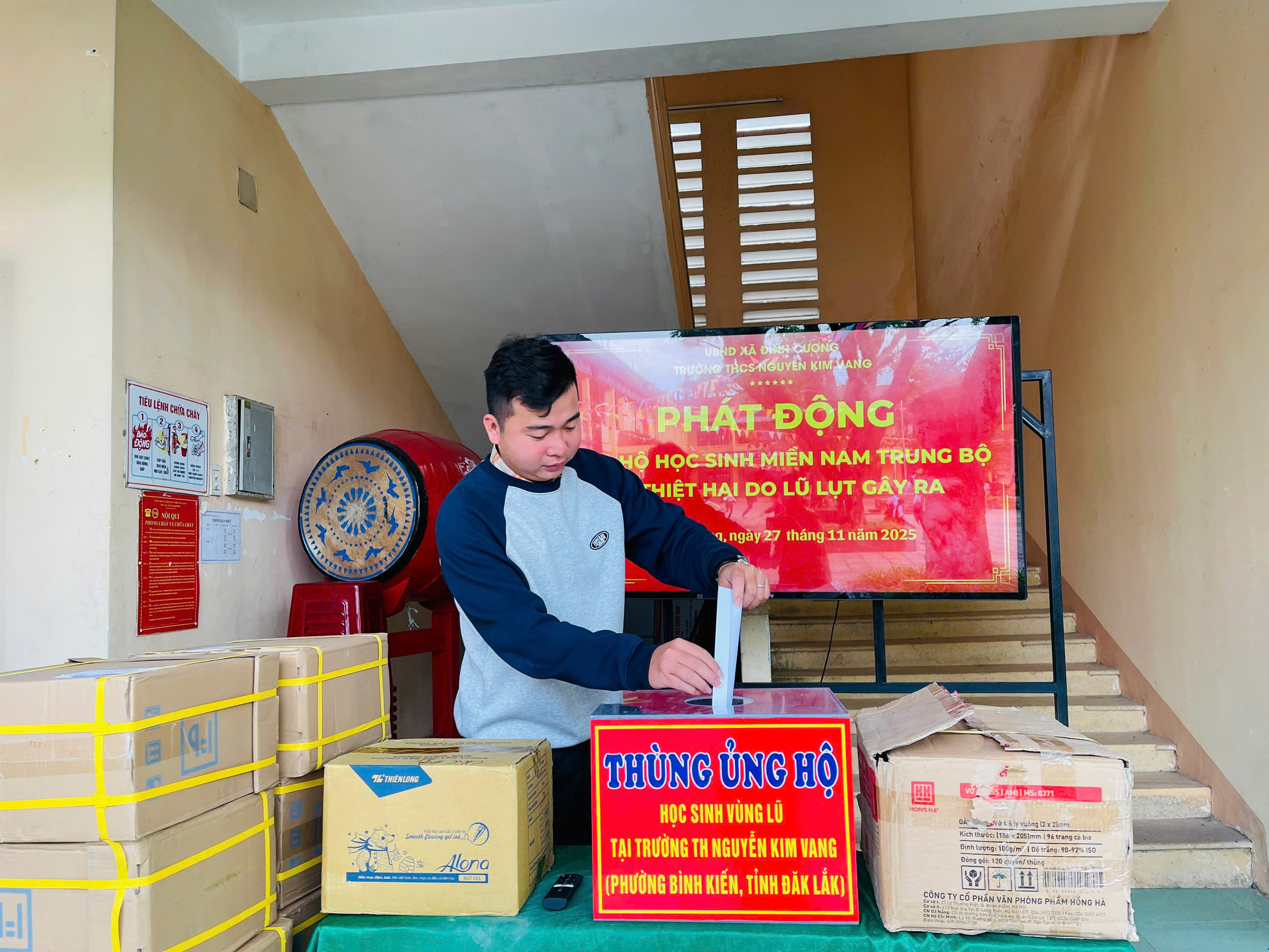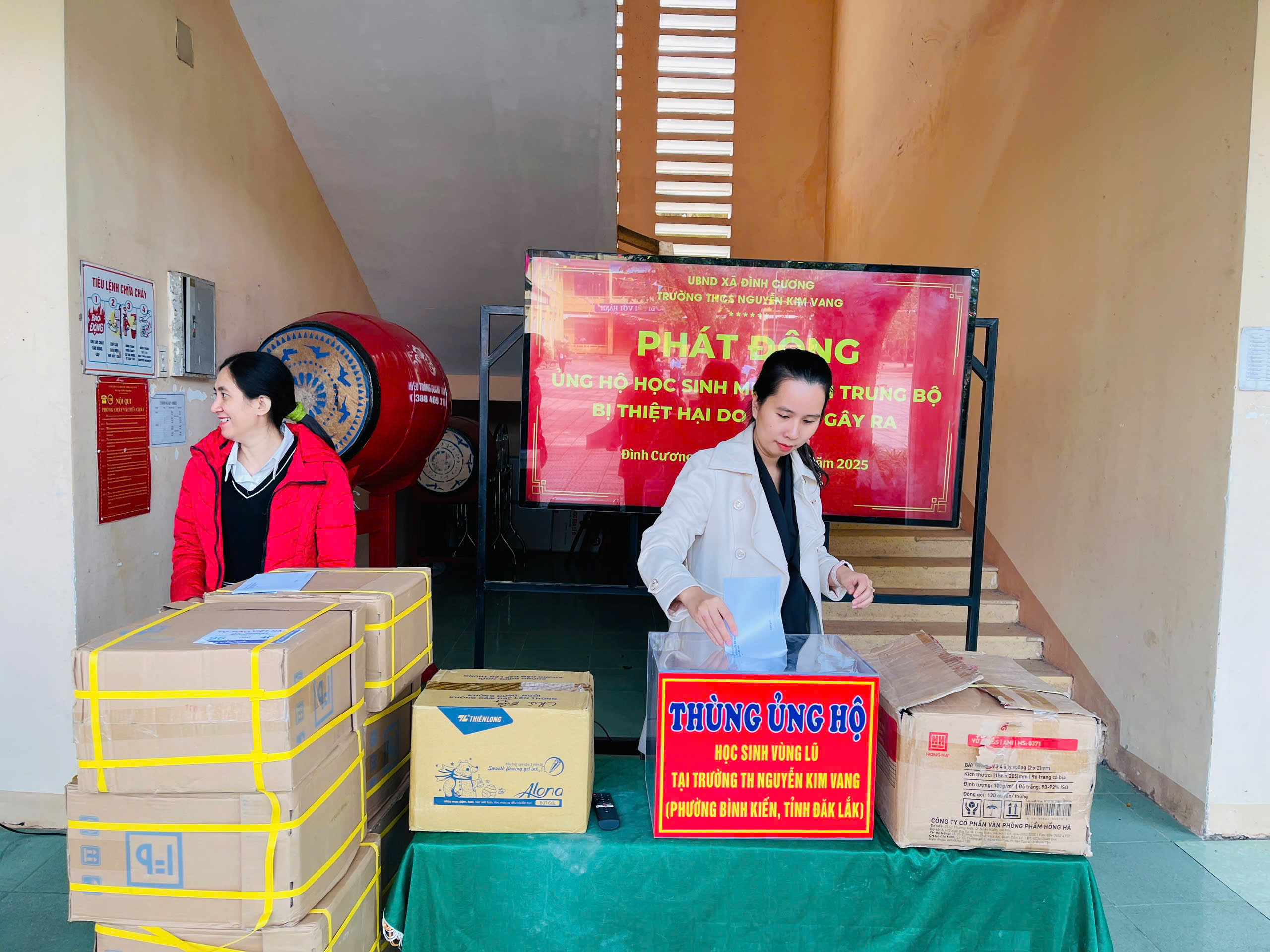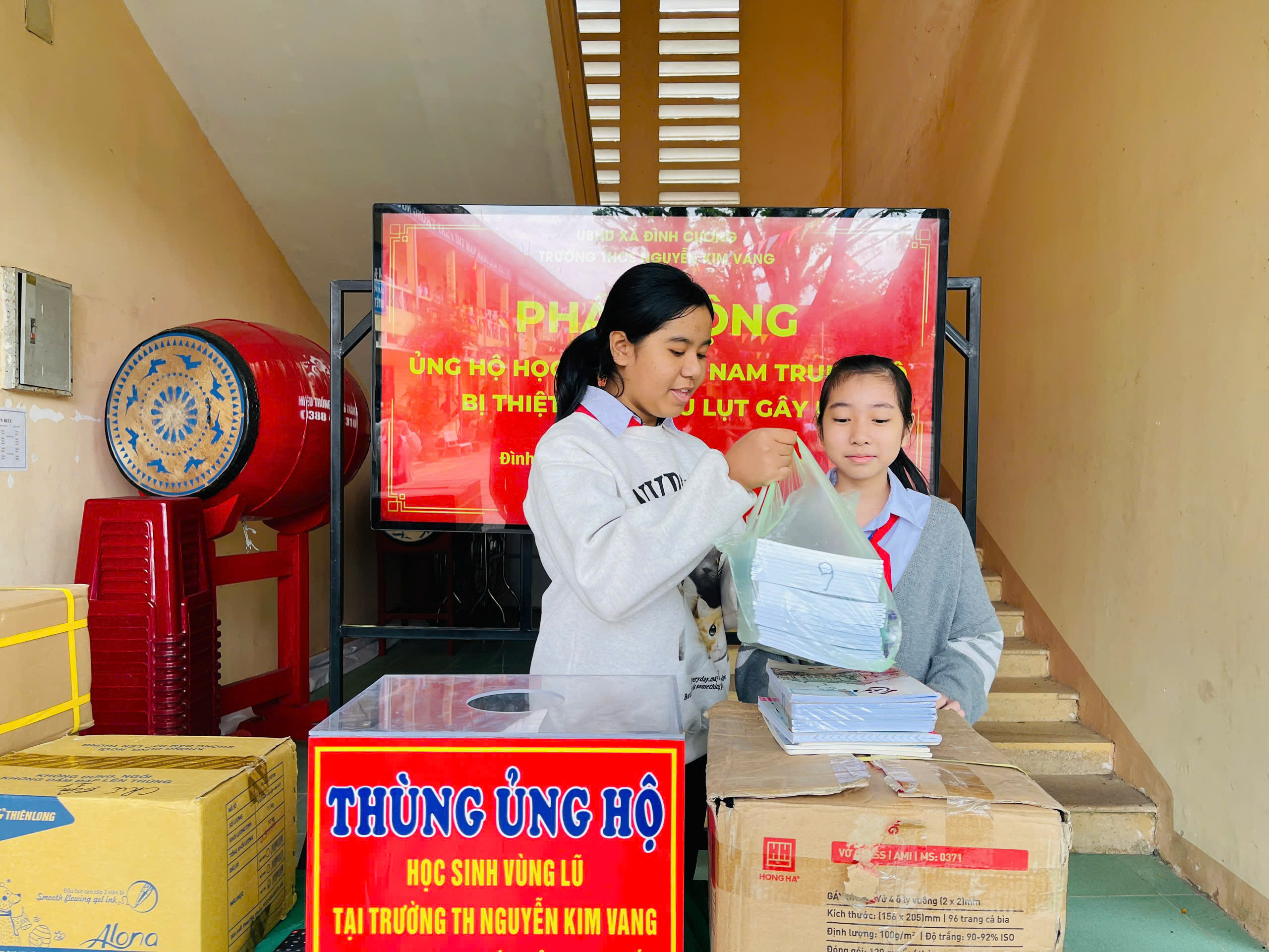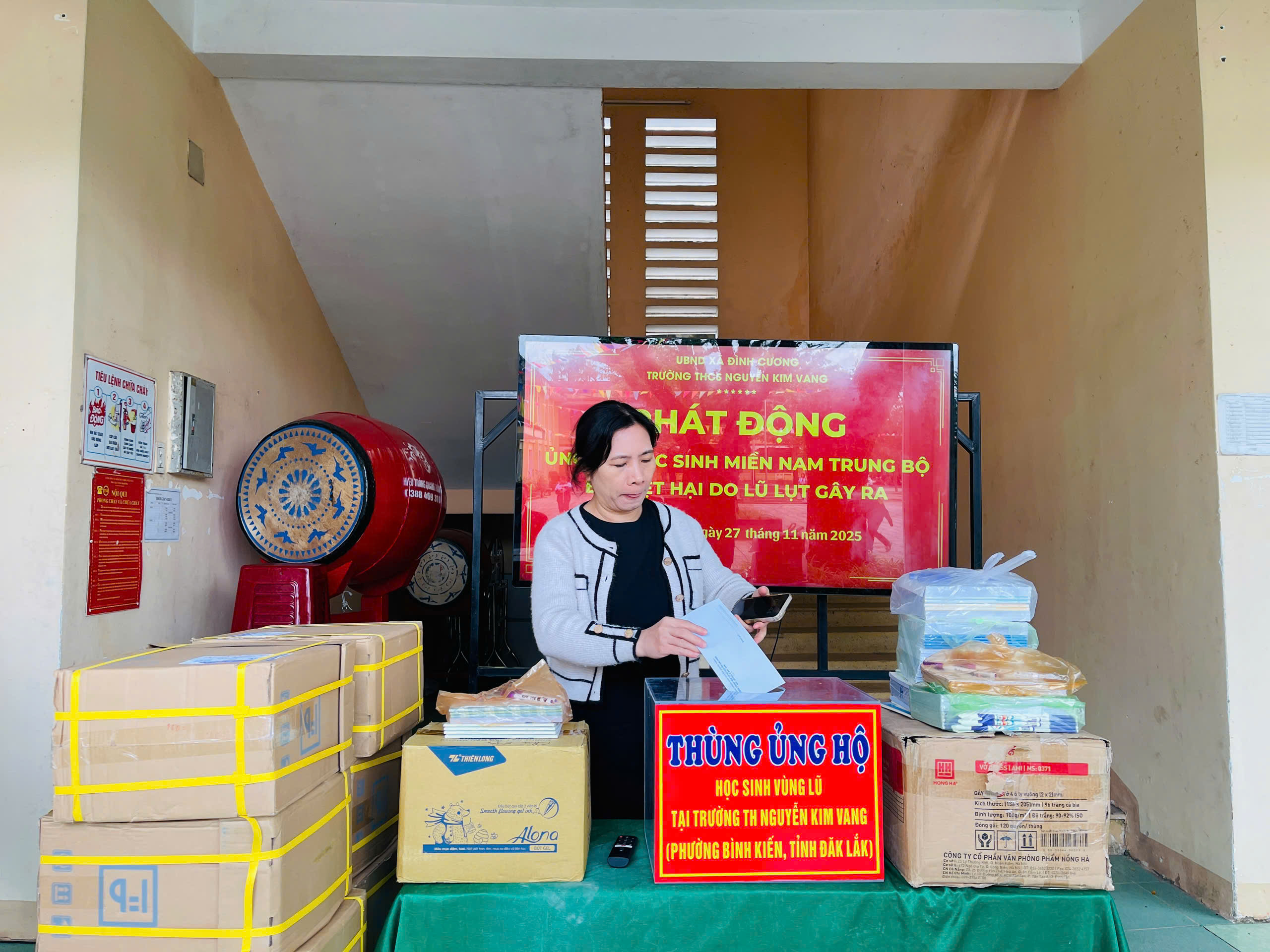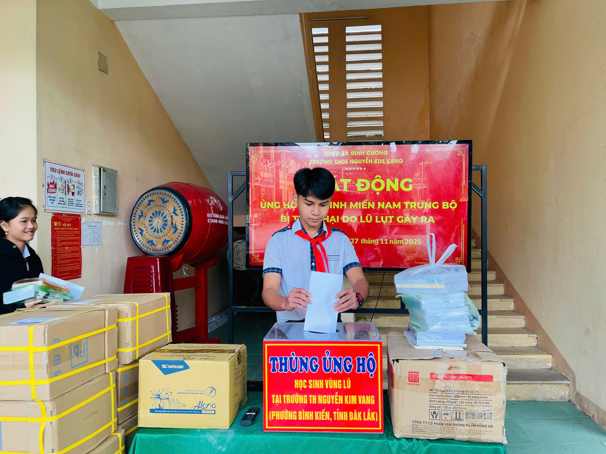 Thực hiện thư kêu gọi của UBMTTQ Việt Nam xã Đình Cương về việc ủng hộ đồng bào các tỉnh nam trung bộ bị ảnh hưởng do lũ lụt gây ra. Với tinh thần tương thân, tương ái ” Lá lành đùm lá rách”. Từ ngày 25/11 đến 27/11/2025 trường THCS Nguyễn Kim Vang tổ chức Lễ phát động và tổng kết đợt quyên góp ủng các tỉnh nam trung bộ bị thiệt hại do lũ lụt gây ra. Với tổng cộng đợt huy động lần này là 15.444.000 đồng (trong đó: Câu lạc bộn hưu trí của trường ủng hộ 2.900.000đ; CBGVNV ủng hộ 6.000.000đ; PHHS 11 lớp ủng hộ vở + viết và tiền mặt là 6.544.000đ ). Tất cả vở, viết và tiền mặt nhà trường sẽ thành lập Đoàn và trao trực tiếp cho các em học sinh tại trường TH Nguyễn Kim Vang, Phường Bình Kiến, tỉnh Phú Yên(cũ) nay là tỉnh Đắc Lắc vào sáng ngày 28/11/2025. Thay lãnh đạo nhà trường xin ghi nhận tấm lòng chia sẻ yêu thương, đùm bọc nhau trong lúc khó khăn hoạn nạn của thầy cô giáo nghỉ hưu, CBGVNV nhà trường và toàn PHHS.