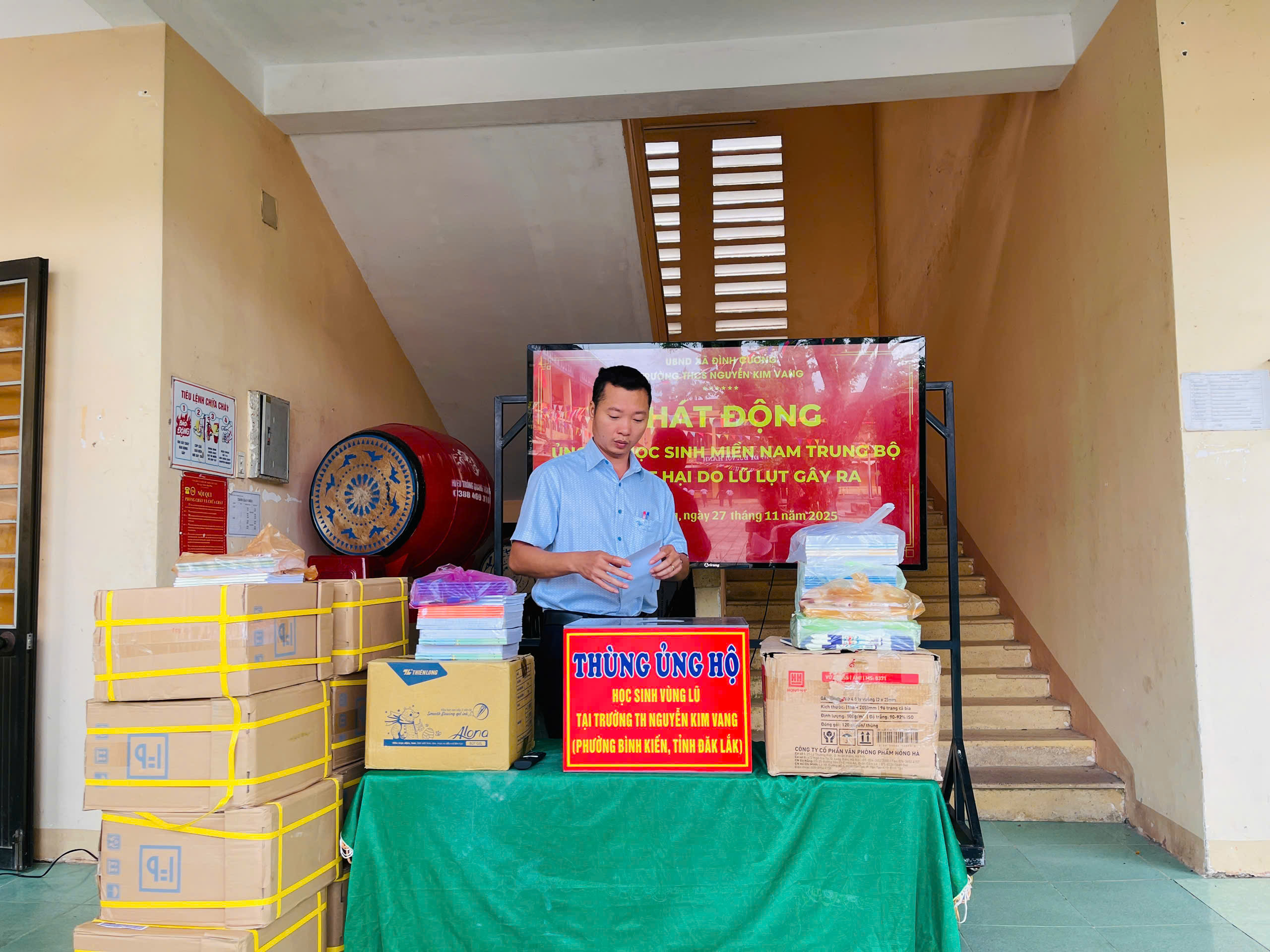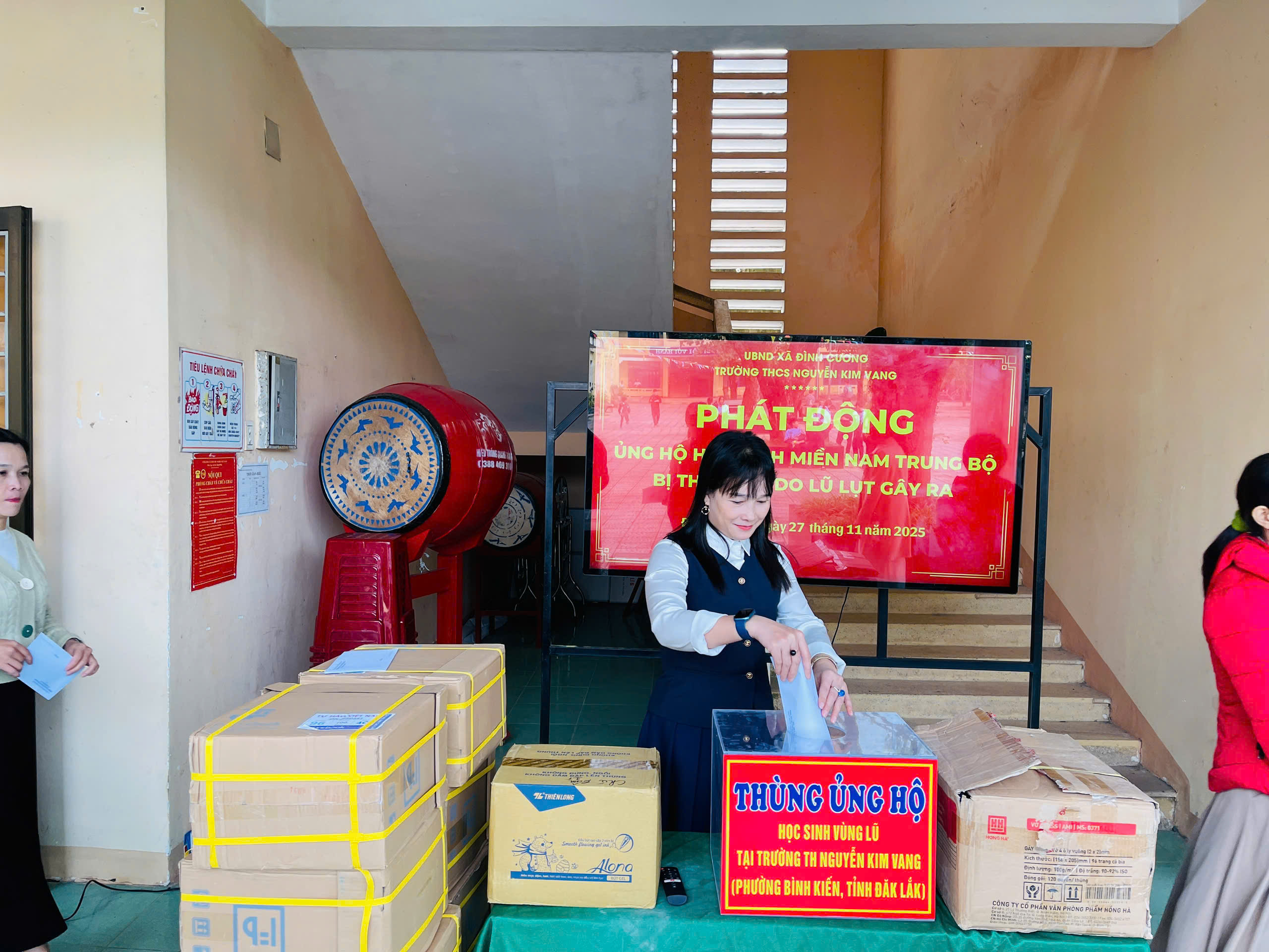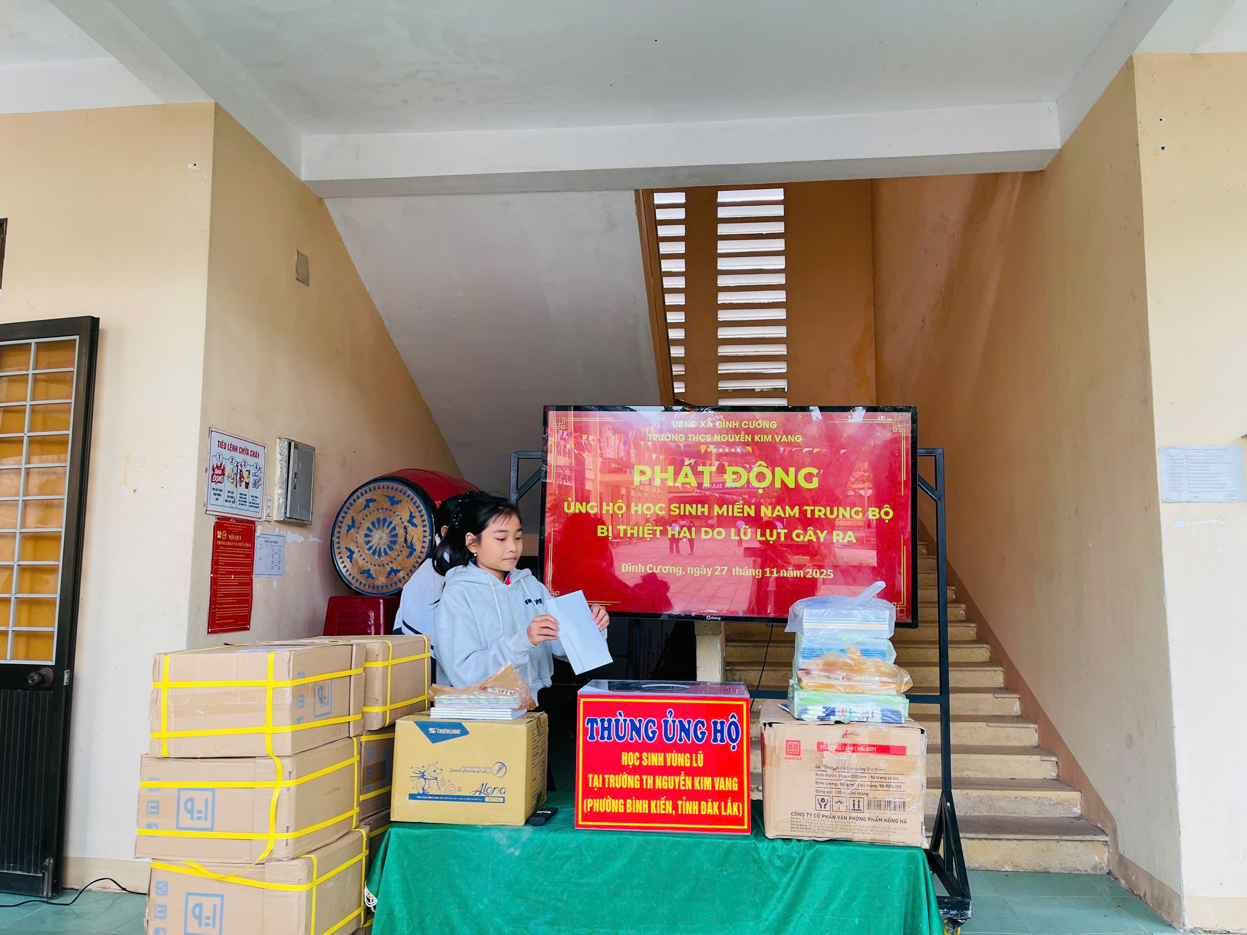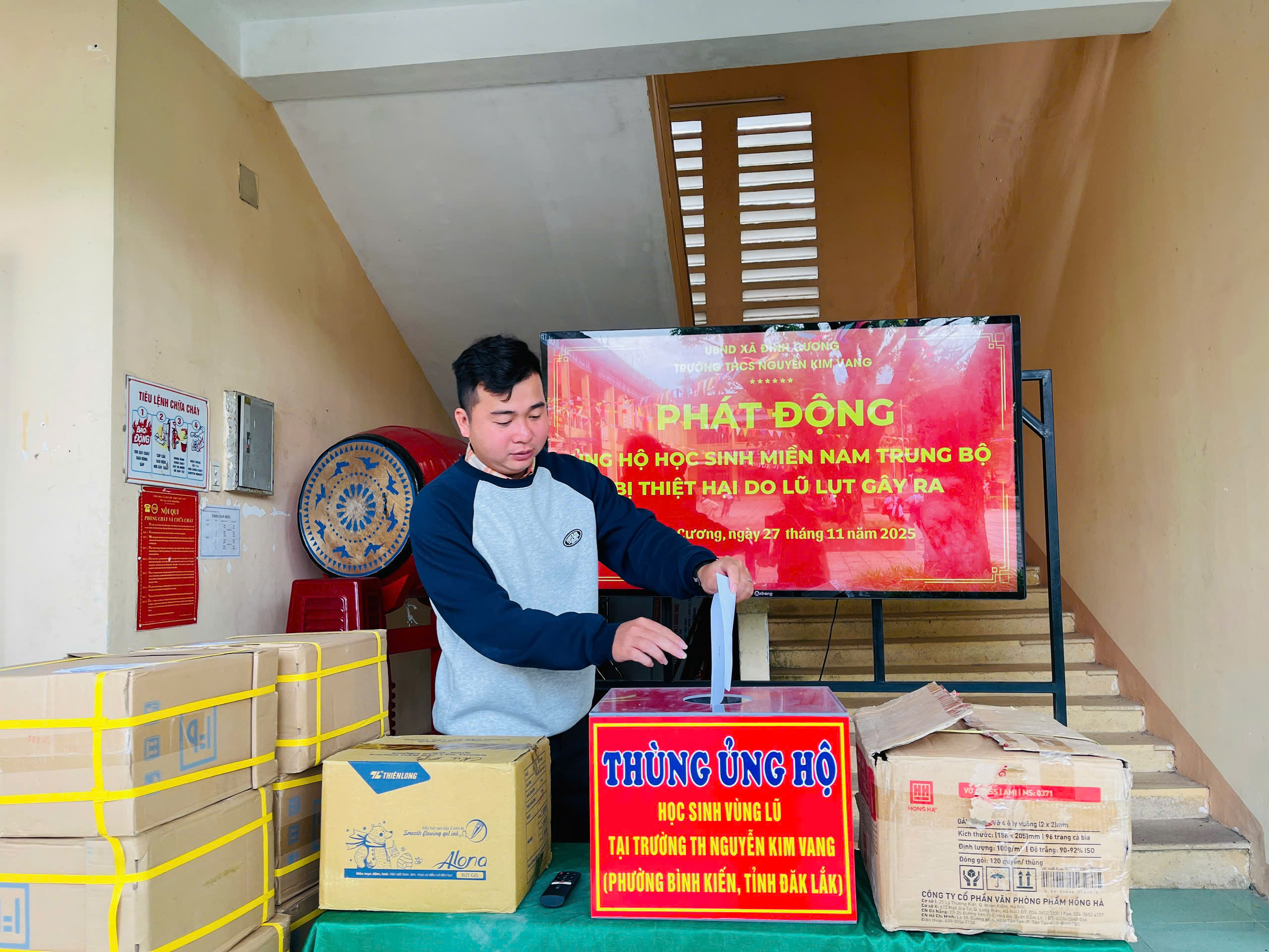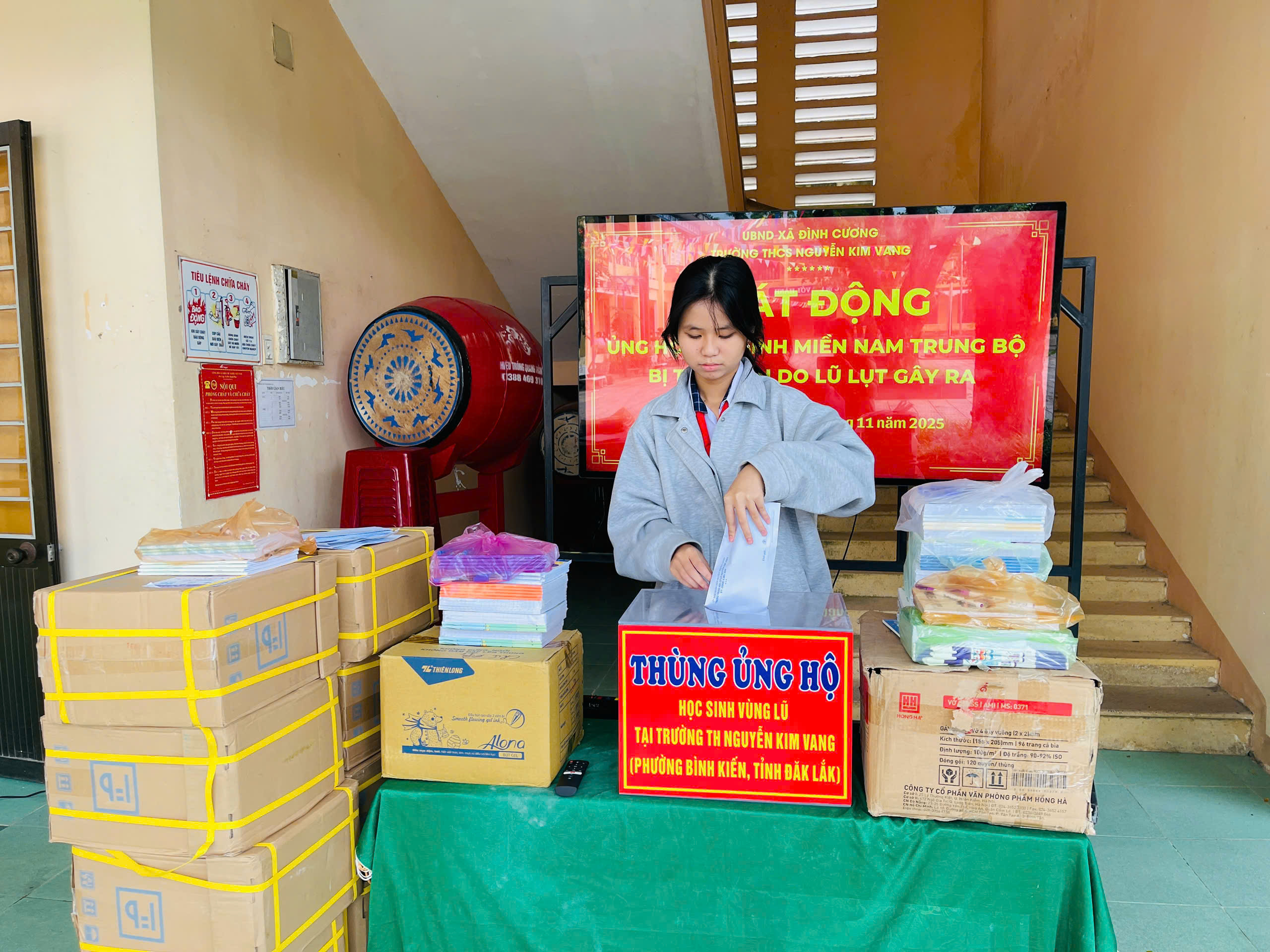 Thực hiện thư kêu gọi của UBMTTQ Việt Nam xã Đình Cương về việc ủng hộ đồng bào các tỉnh nam trung bộ bị ảnh hưởng do lũ lụt gây ra. Với tinh thần tương thân, tương ái ” Lá lành đùm lá rách”. Từ ngày 25/11 đến 27/11/2025 trường THCS Nguyễn Kim Vang tổ chức Lễ phát động và tổng kết đợt quyên góp ủng các tỉnh nam trung bộ bị thiệt hại do lũ lụt gây ra. Với tổng cộng đợt huy động lần này là 15.444.000 đồng (trong đó: Câu lạc bộn hưu trí của trường ủng hộ 2.900.000đ; CBGVNV ủng hộ 6.000.000đ; PHHS 11 lớp ủng hộ vở + viết và tiền mặt là 6.544.000đ ). Tất cả vở, viết và tiền mặt nhà trường sẽ thành lập Đoàn và trao trực tiếp cho các em học sinh tại trường TH Nguyễn Kim Vang, Phường Bình Kiến, tỉnh Phú Yên(cũ) nay là tỉnh Đắc Lắc vào sáng ngày 28/11/2025. Thay lãnh đạo nhà trường xin ghi nhận tấm lòng chia sẻ yêu thương, đùm bọc nhau trong lúc khó khăn hoạn nạn của thầy cô giáo nghỉ hưu, CBGVNV nhà trường và toàn PHHS.