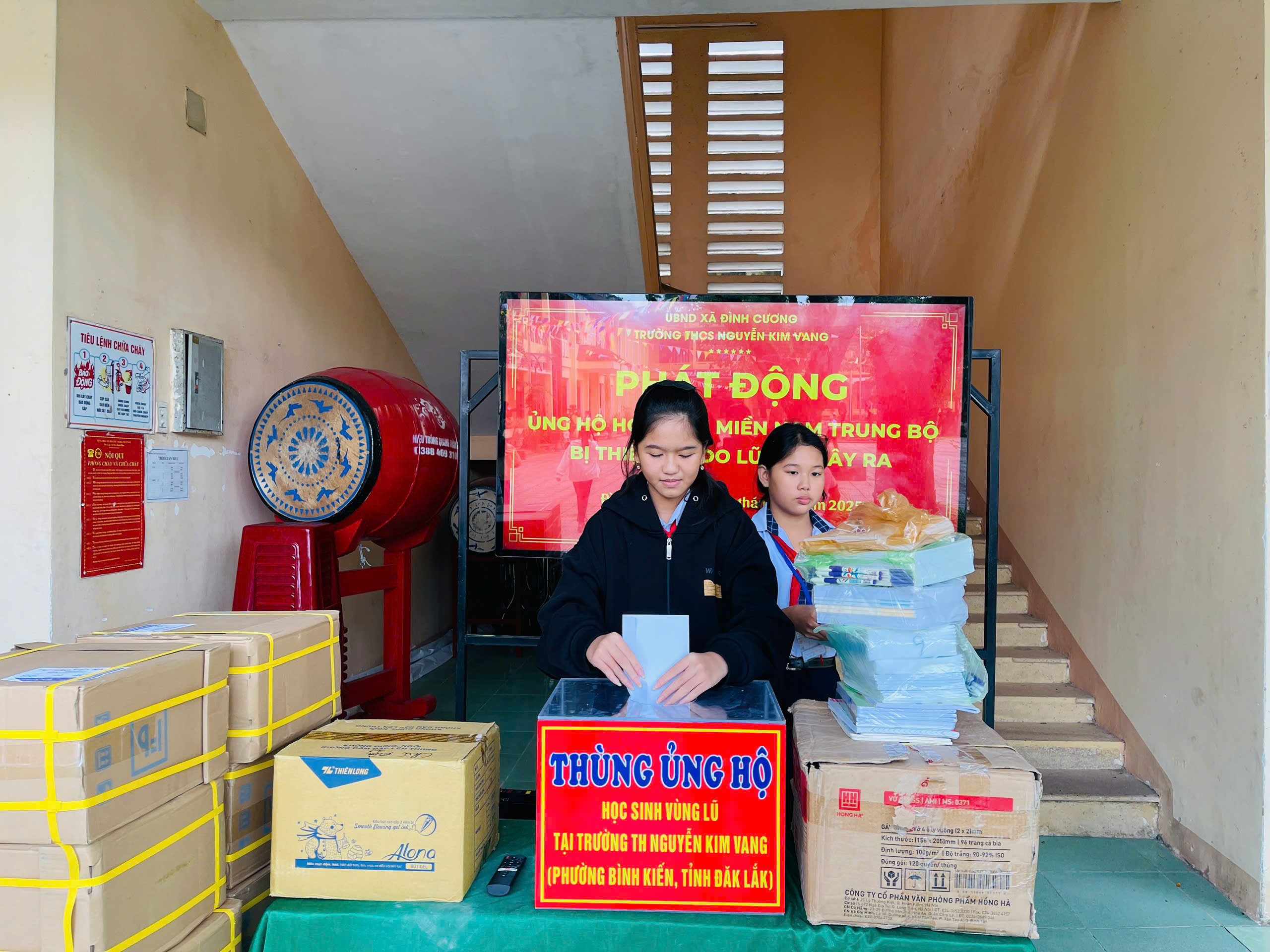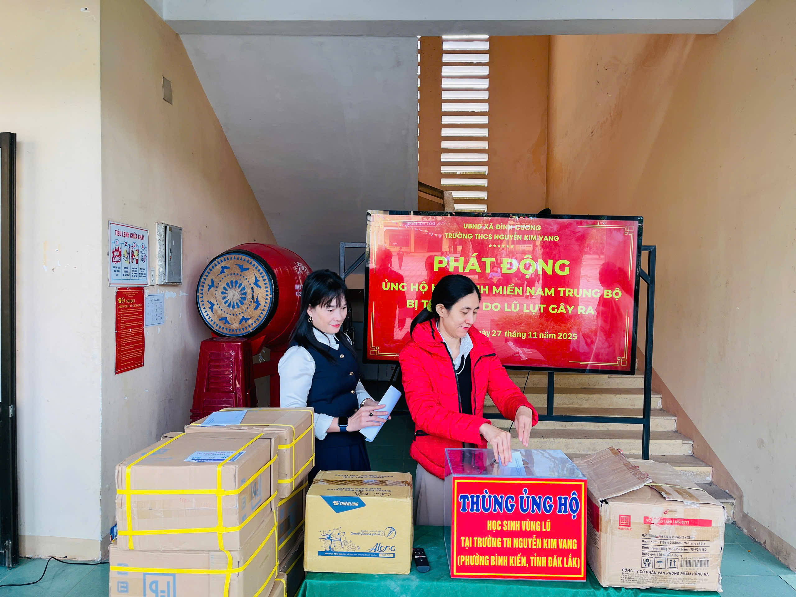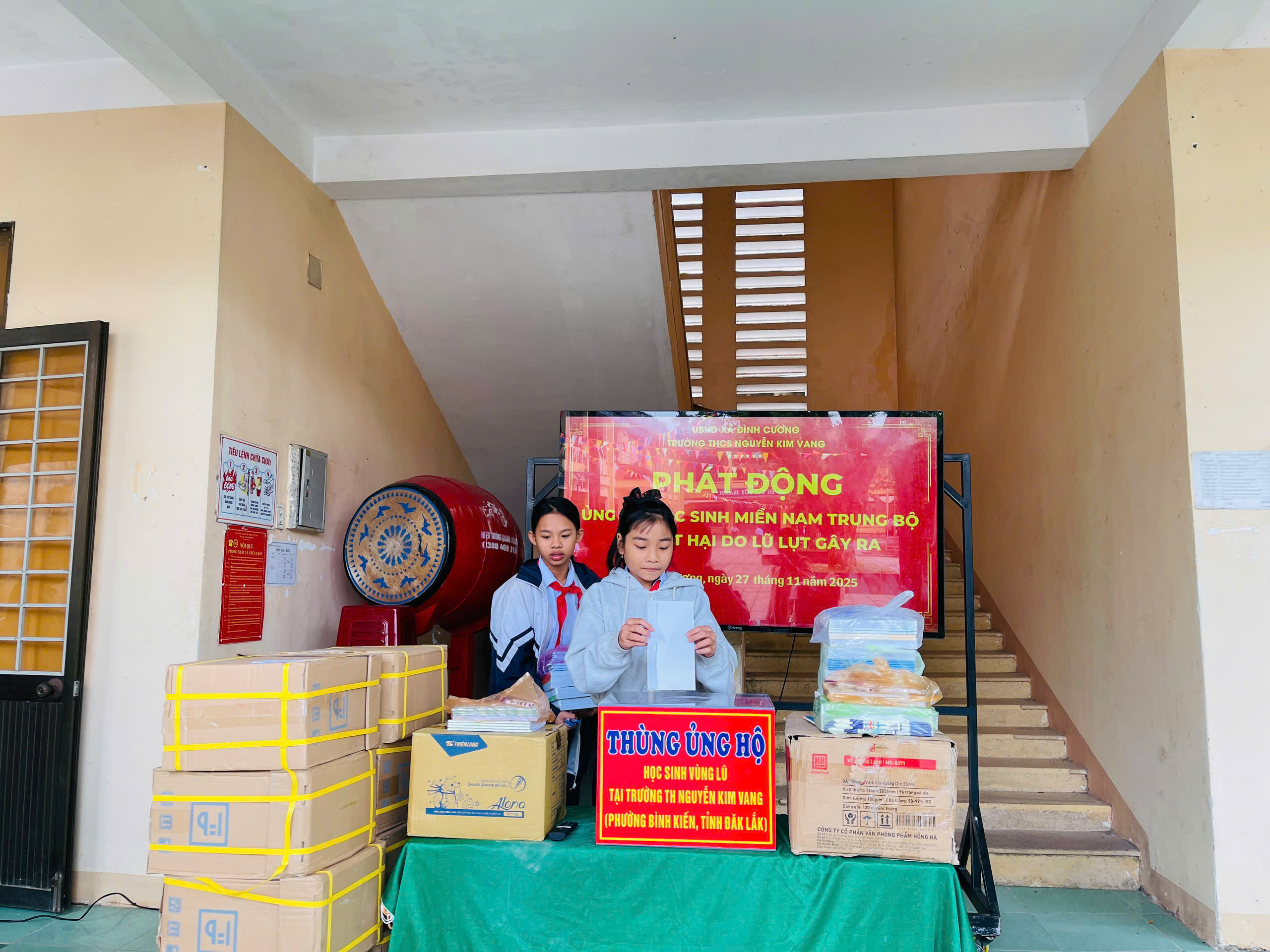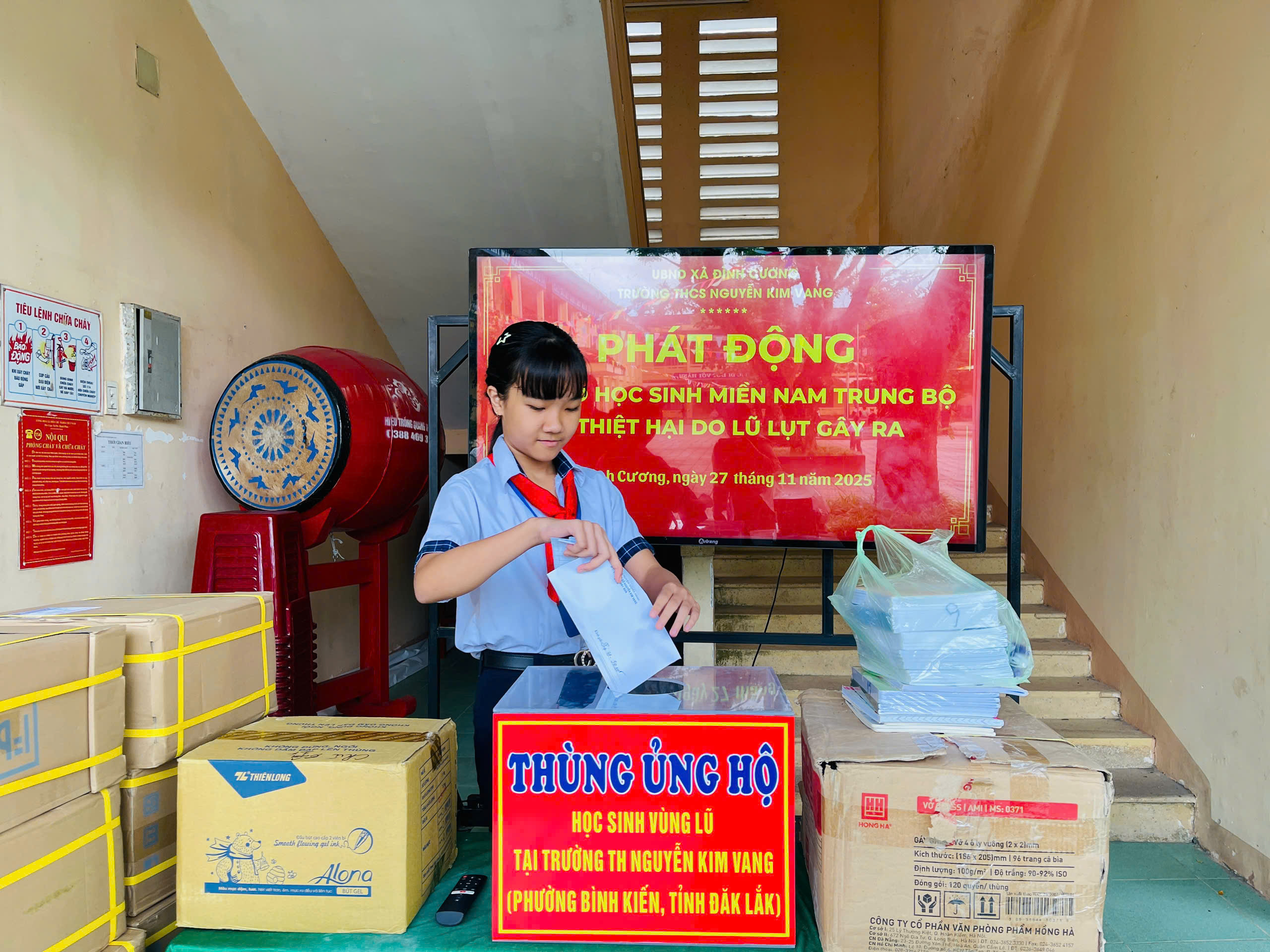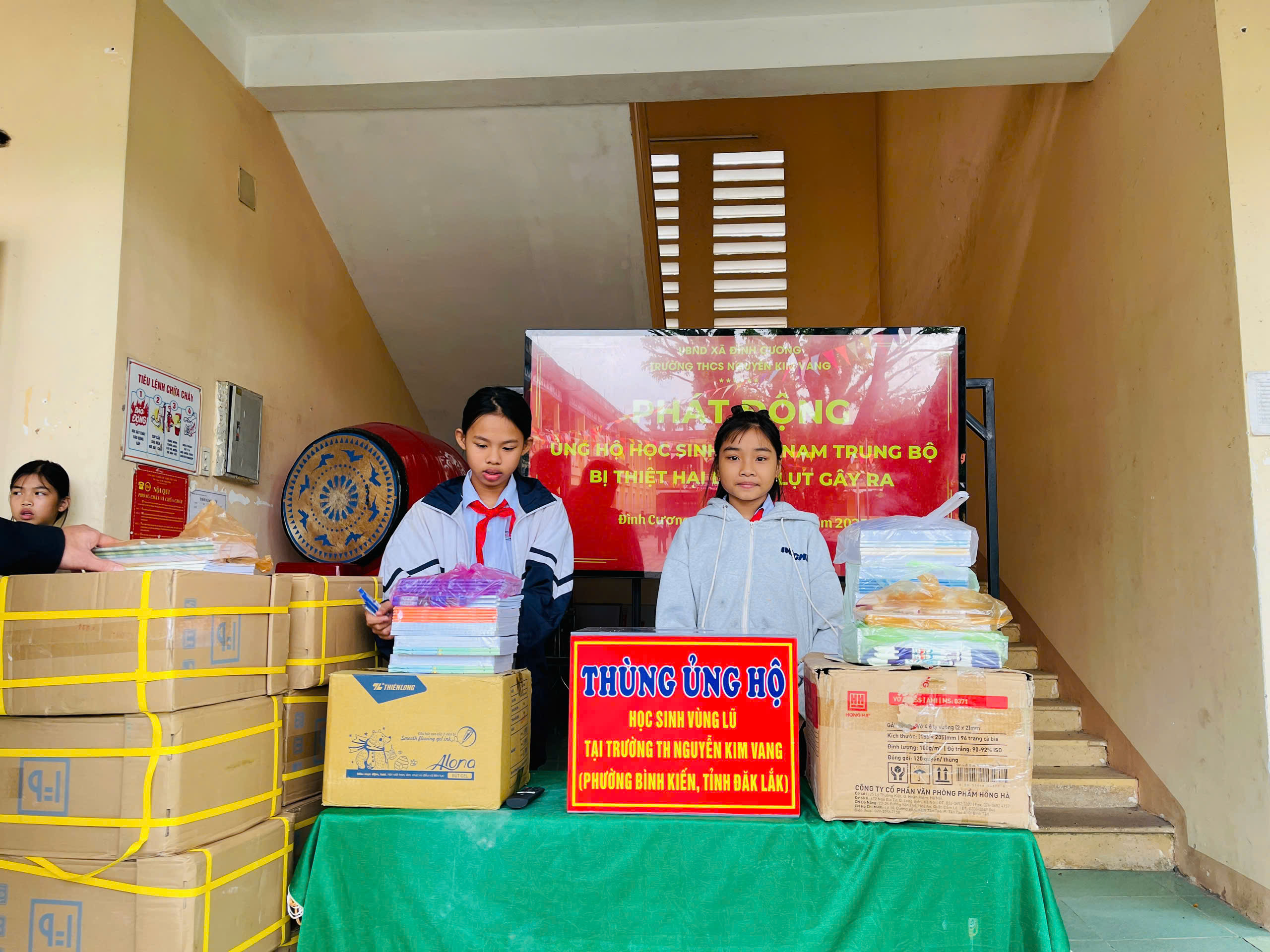 Thực hiện thư kêu gọi của UBMTTQ Việt Nam xã Đình Cương về việc ủng hộ đồng bào các tỉnh nam trung bộ bị ảnh hưởng do lũ lụt gây ra. Với tinh thần tương thân, tương ái ” Lá lành đùm lá rách”. Từ ngày 25/11 đến 27/11/2025 trường THCS Nguyễn Kim Vang tổ chức Lễ phát động và tổng kết đợt quyên góp ủng các tỉnh nam trung bộ bị thiệt hại do lũ lụt gây ra. Với tổng cộng đợt huy động lần này là 15.444.000 đồng (trong đó: Câu lạc bộn hưu trí của trường ủng hộ 2.900.000đ; CBGVNV ủng hộ 6.000.000đ; PHHS 11 lớp ủng hộ vở + viết và tiền mặt là 6.544.000đ ). Tất cả vở, viết và tiền mặt nhà trường sẽ thành lập Đoàn và trao trực tiếp cho các em học sinh tại trường TH Nguyễn Kim Vang, Phường Bình Kiến, tỉnh Phú Yên(cũ) nay là tỉnh Đắc Lắc vào sáng ngày 28/11/2025. Thay lãnh đạo nhà trường xin ghi nhận tấm lòng chia sẻ yêu thương, đùm bọc nhau trong lúc khó khăn hoạn nạn của thầy cô giáo nghỉ hưu, CBGVNV nhà trường và toàn PHHS.