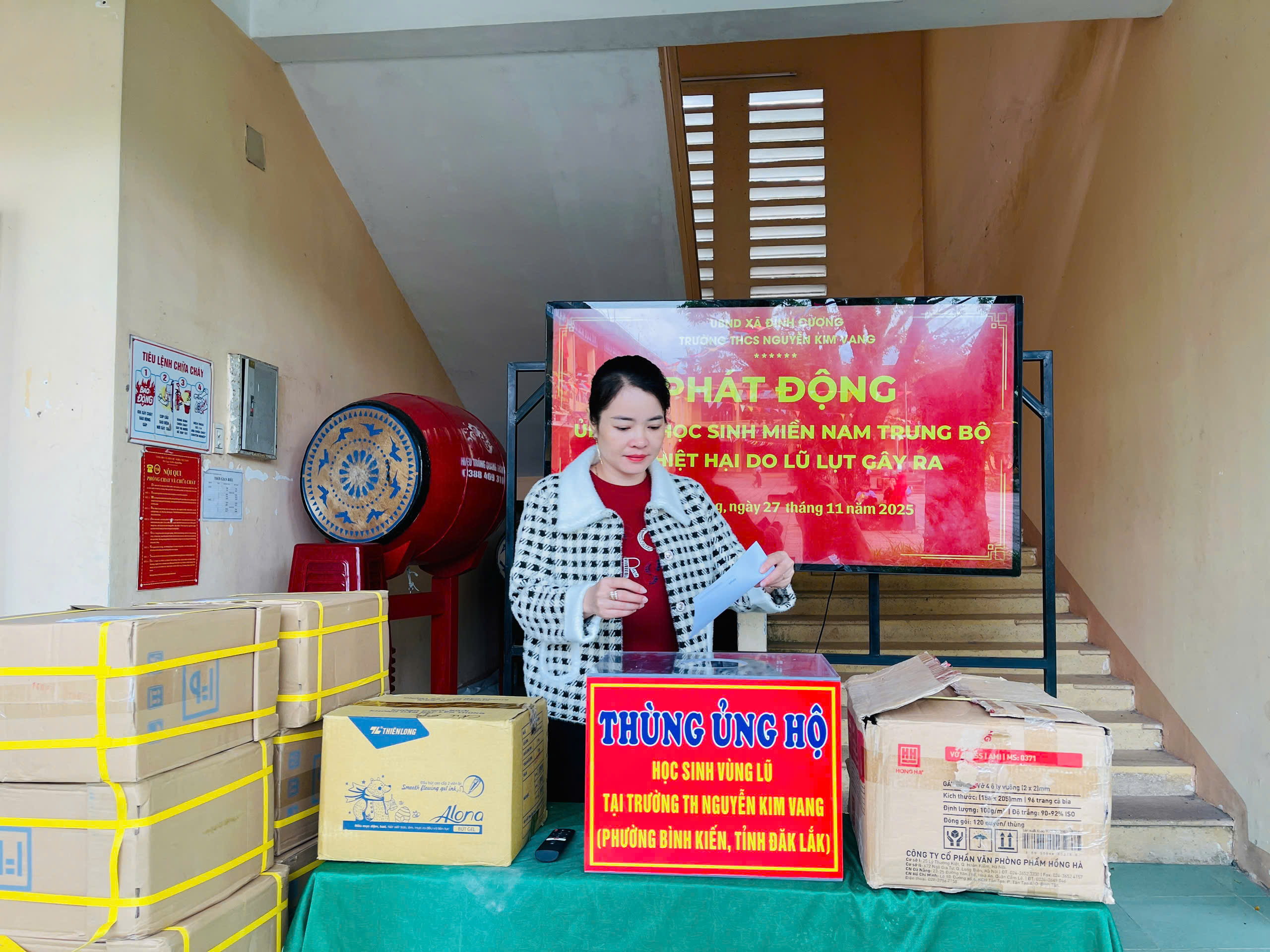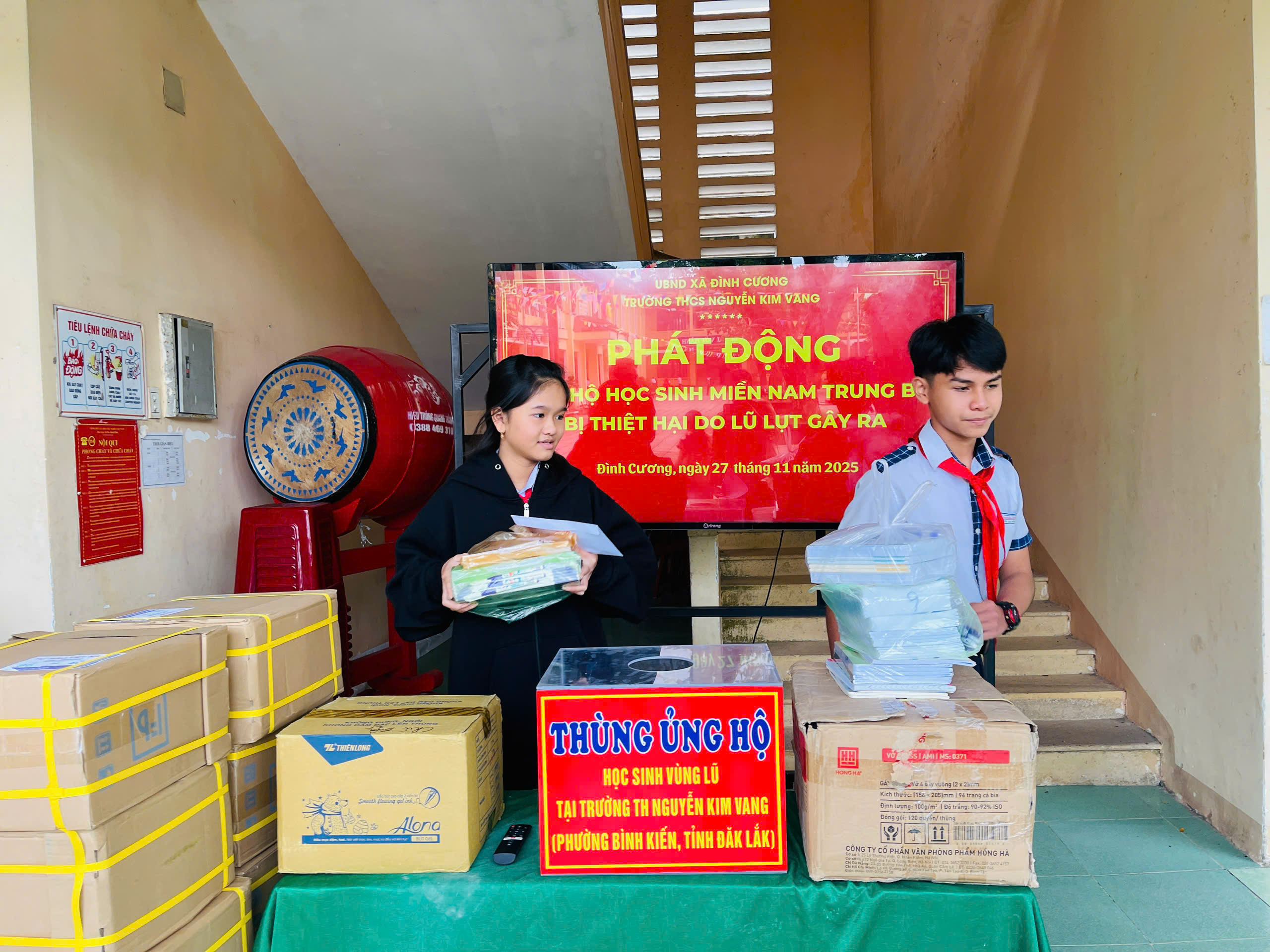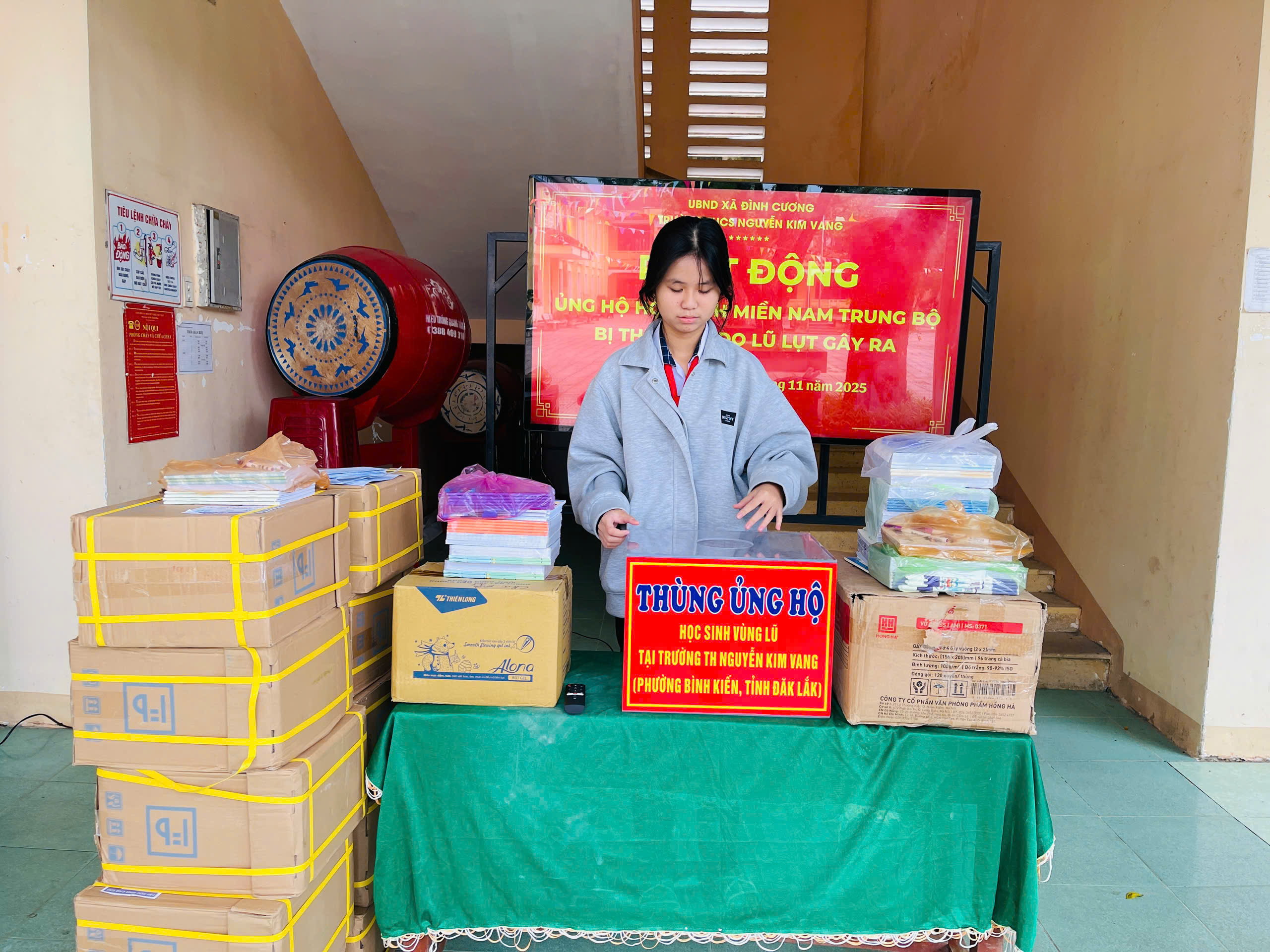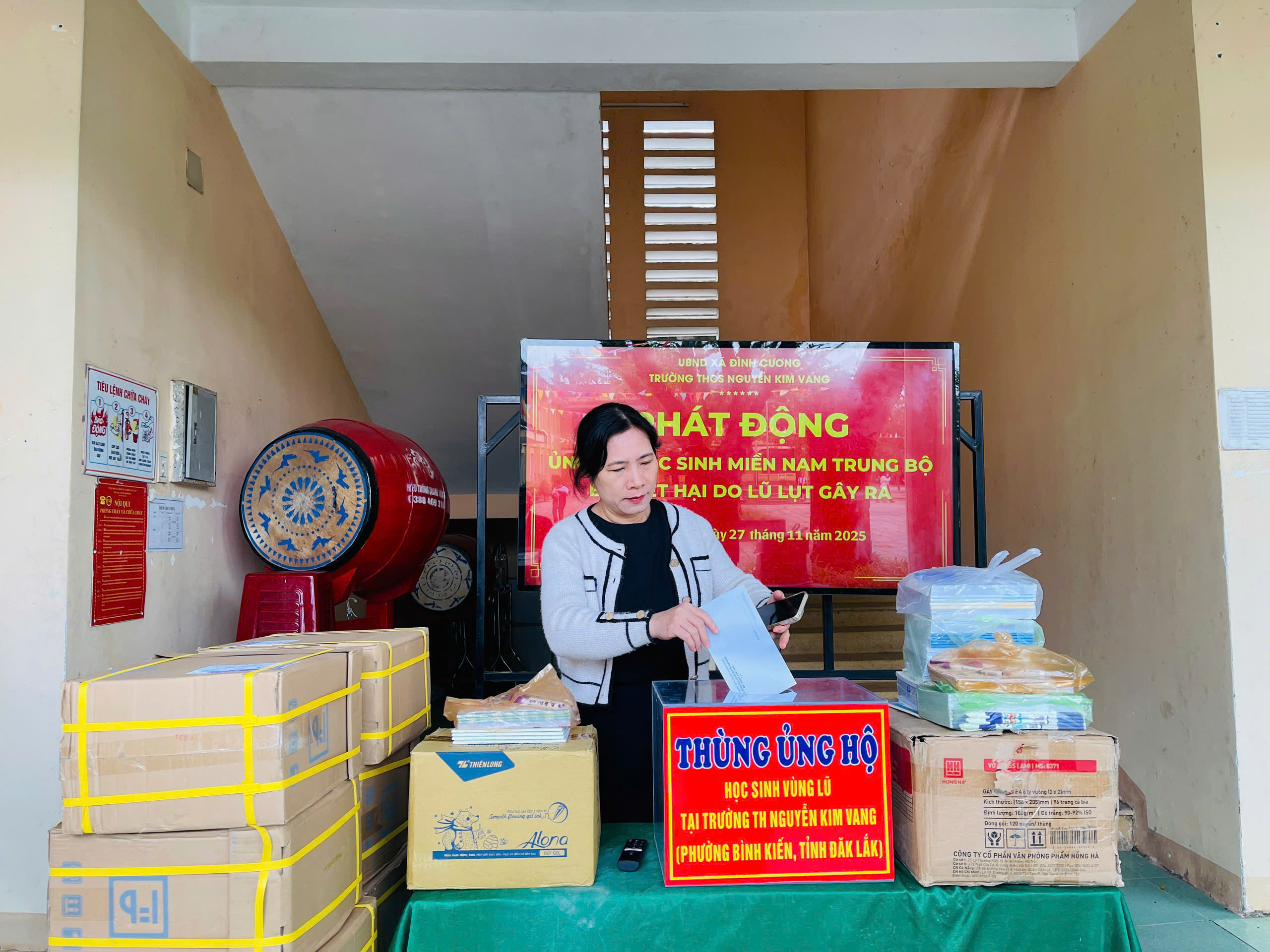 Thực hiện thư kêu gọi của UBMTTQ Việt Nam xã Đình Cương về việc ủng hộ đồng bào các tỉnh nam trung bộ bị ảnh hưởng do lũ lụt gây ra. Với tinh thần tương thân, tương ái ” Lá lành đùm lá rách”. Từ ngày 25/11 đến 27/11/2025 trường THCS Nguyễn Kim Vang tổ chức Lễ phát động và tổng kết đợt quyên góp ủng các tỉnh nam trung bộ bị thiệt hại do lũ lụt gây ra. Với tổng cộng đợt huy động lần này là 15.444.000 đồng (trong đó: Câu lạc bộn hưu trí của trường ủng hộ 2.900.000đ; CBGVNV ủng hộ 6.000.000đ; PHHS 11 lớp ủng hộ vở + viết và tiền mặt là 6.544.000đ ). Tất cả vở, viết và tiền mặt nhà trường sẽ thành lập Đoàn và trao trực tiếp cho các em học sinh tại trường TH Nguyễn Kim Vang, Phường Bình Kiến, tỉnh Phú Yên(cũ) nay là tỉnh Đắc Lắc vào sáng ngày 28/11/2025. Thay lãnh đạo nhà trường xin ghi nhận tấm lòng chia sẻ yêu thương, đùm bọc nhau trong lúc khó khăn hoạn nạn của thầy cô giáo nghỉ hưu, CBGVNV nhà trường và toàn PHHS.