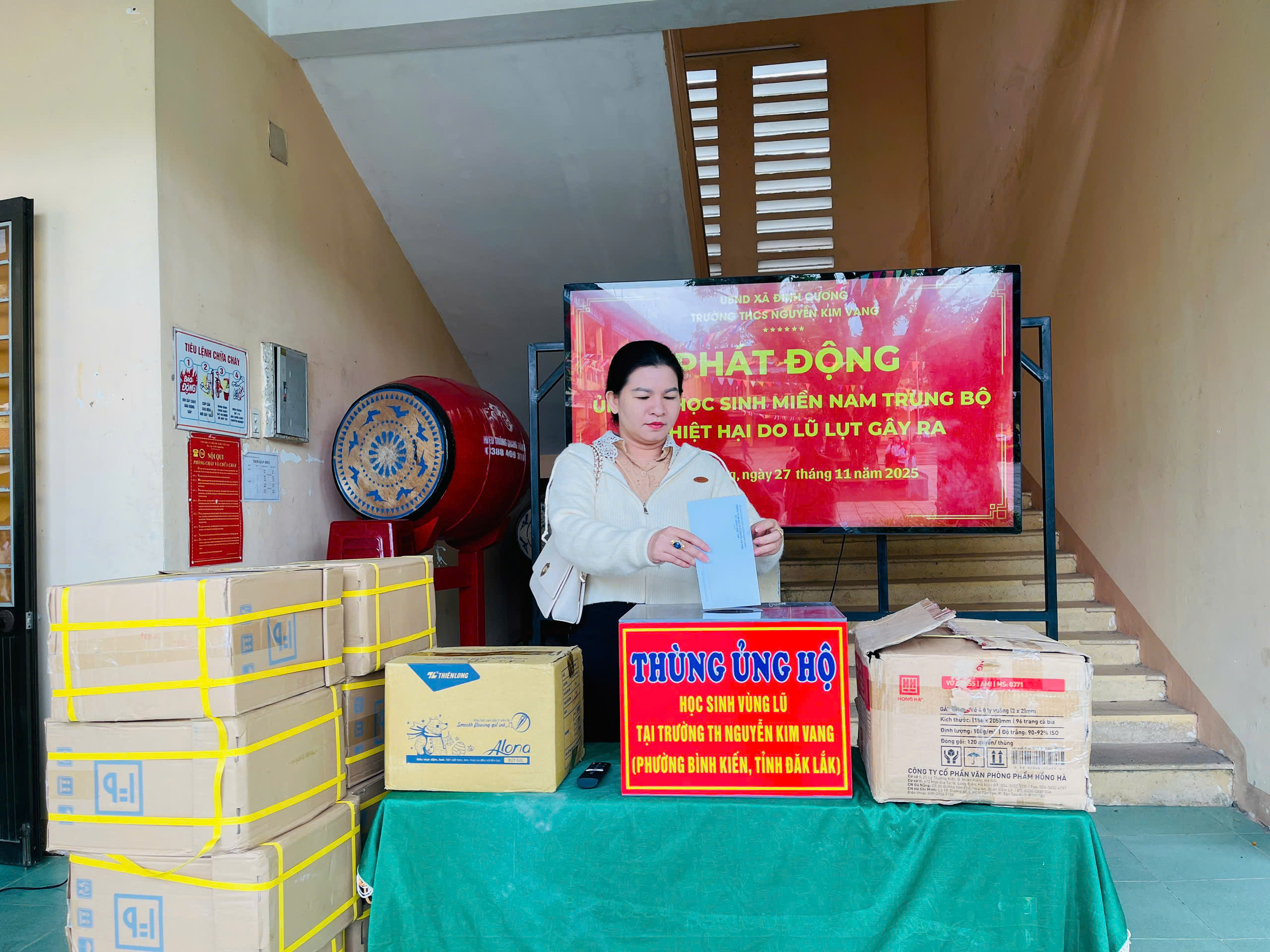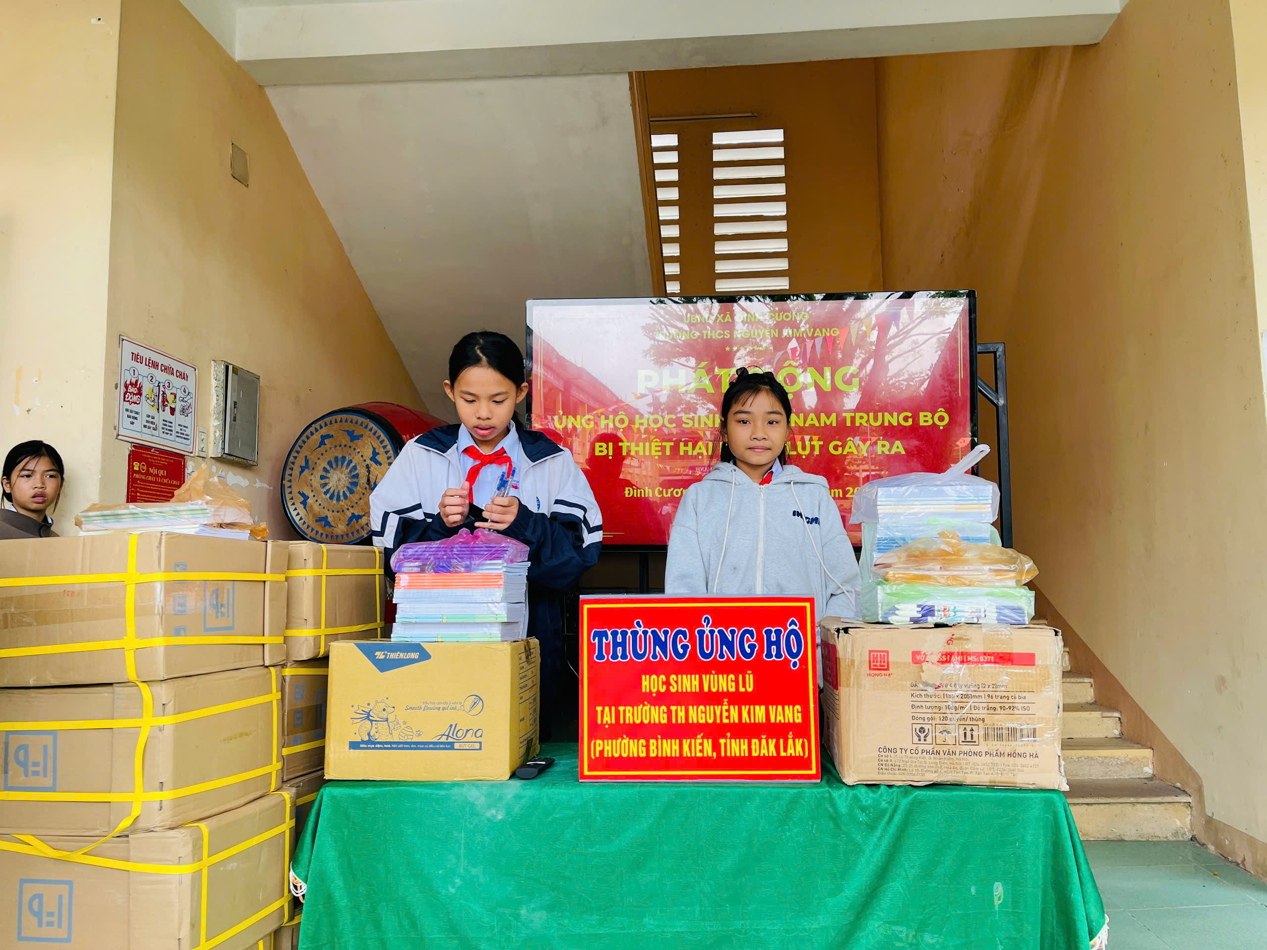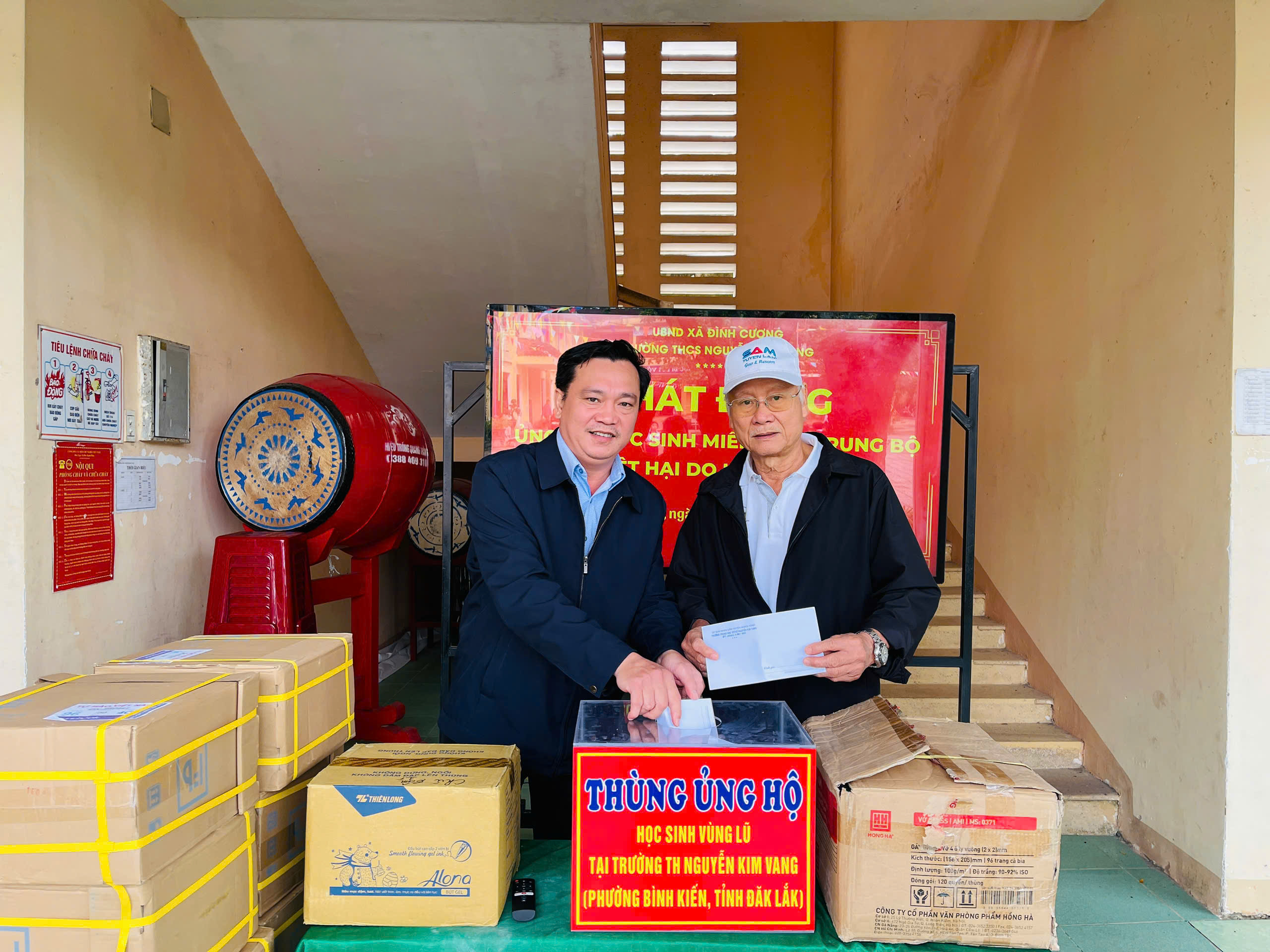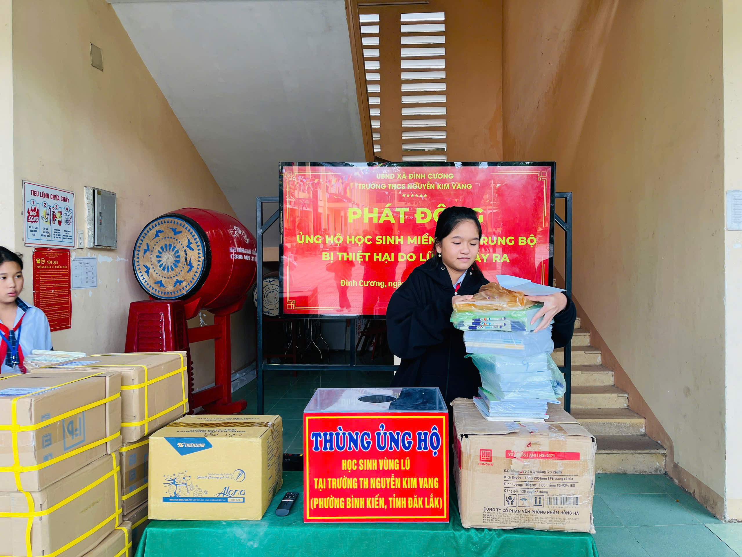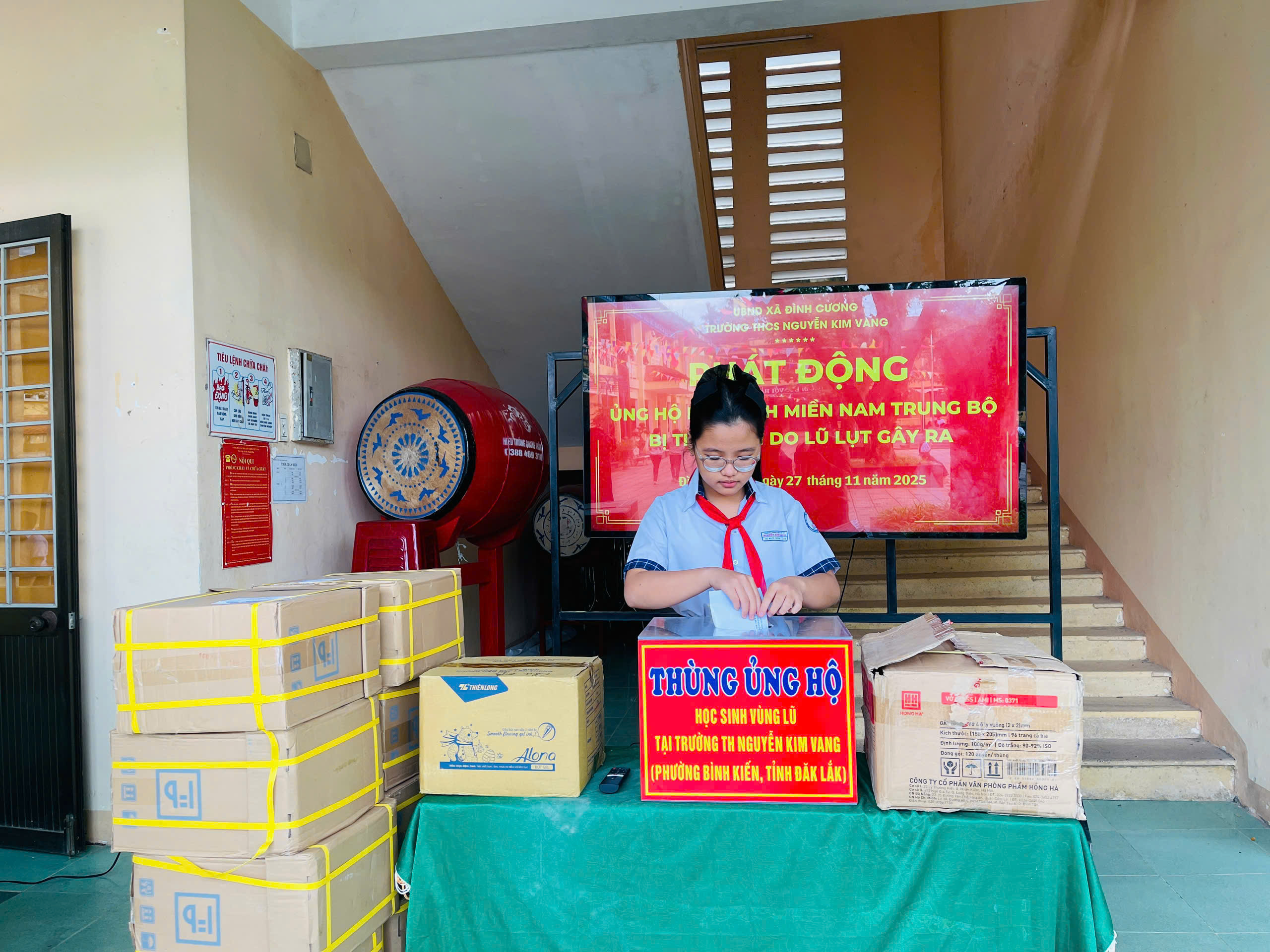 Thực hiện thư kêu gọi của UBMTTQ Việt Nam xã Đình Cương về việc ủng hộ đồng bào các tỉnh nam trung bộ bị ảnh hưởng do lũ lụt gây ra. Với tinh thần tương thân, tương ái ” Lá lành đùm lá rách”. Từ ngày 25/11 đến 27/11/2025 trường THCS Nguyễn Kim Vang tổ chức Lễ phát động và tổng kết đợt quyên góp ủng các tỉnh nam trung bộ bị thiệt hại do lũ lụt gây ra. Với tổng cộng đợt huy động lần này là 15.444.000 đồng (trong đó: Câu lạc bộn hưu trí của trường ủng hộ 2.900.000đ; CBGVNV ủng hộ 6.000.000đ; PHHS 11 lớp ủng hộ vở + viết và tiền mặt là 6.544.000đ ). Tất cả vở, viết và tiền mặt nhà trường sẽ thành lập Đoàn và trao trực tiếp cho các em học sinh tại trường TH Nguyễn Kim Vang, Phường Bình Kiến, tỉnh Phú Yên(cũ) nay là tỉnh Đắc Lắc vào sáng ngày 28/11/2025. Thay lãnh đạo nhà trường xin ghi nhận tấm lòng chia sẻ yêu thương, đùm bọc nhau trong lúc khó khăn hoạn nạn của thầy cô giáo nghỉ hưu, CBGVNV nhà trường và toàn PHHS.
